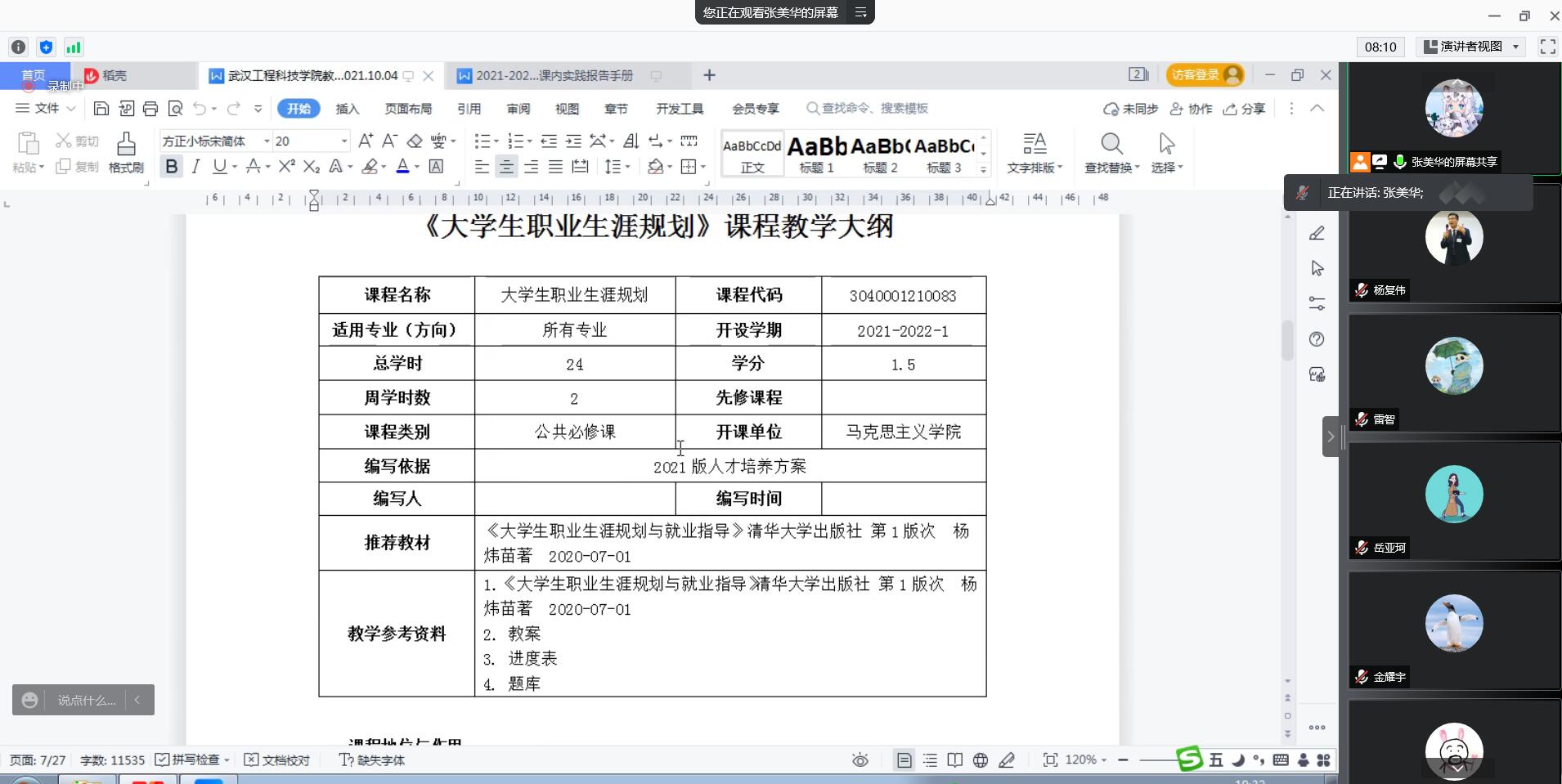 (通讯员 杨复伟)2021级新生的《职业生涯规划》课程开课在即,为了让课程更好地呈现给大一新生,课程组全体授课教师于2021年10月4日在腾讯会议举行了集体备课会。