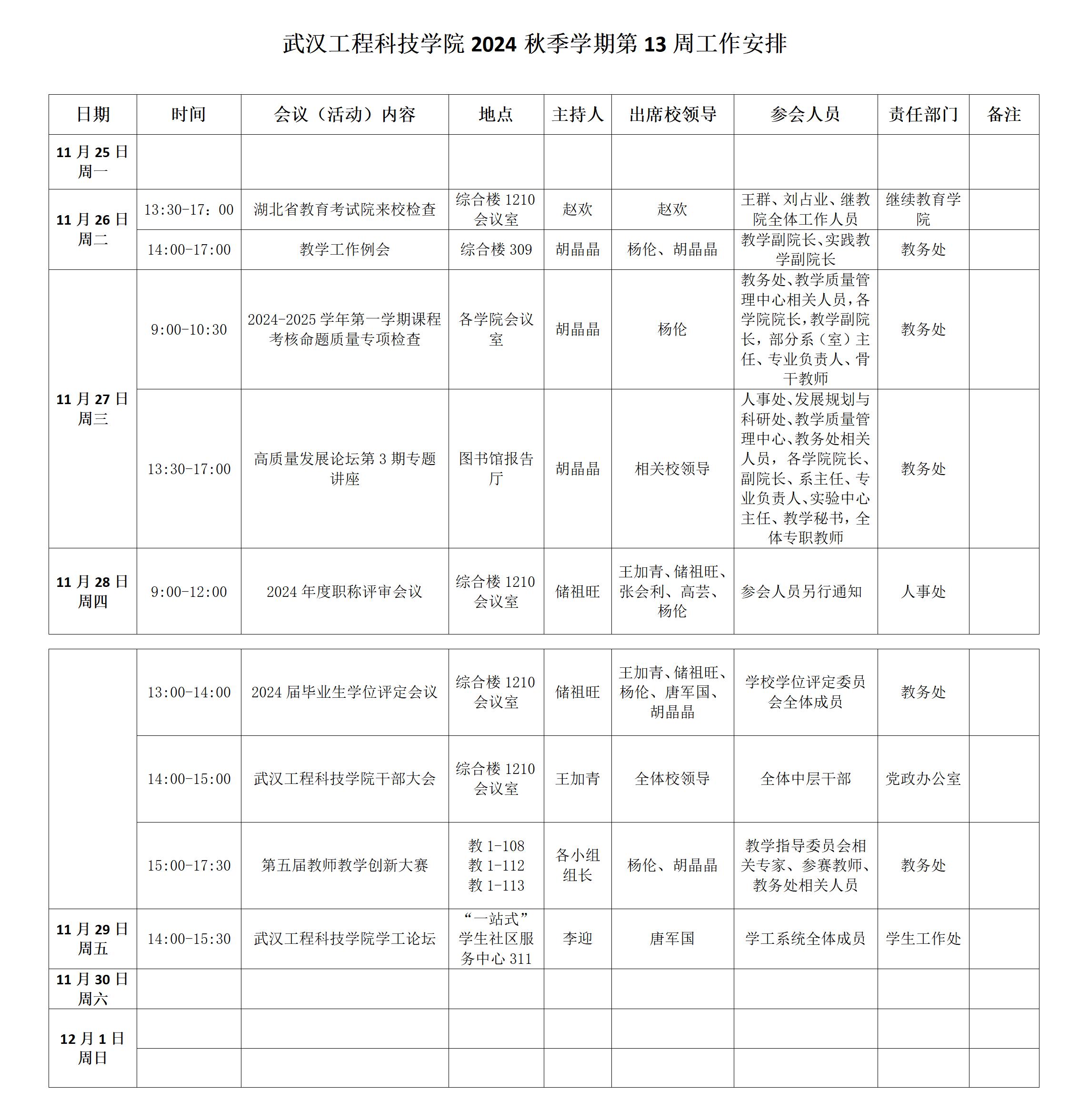 学校2024-2025第一学期第13周工作安排