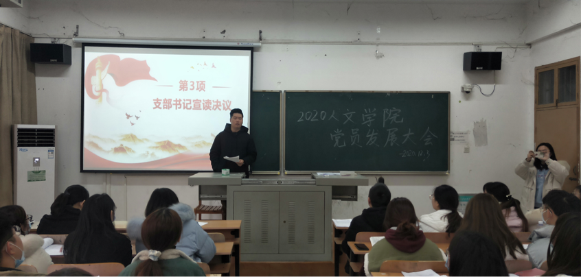 本网讯(通讯员 余佳 汤腾达 曹志华)2020年12月3日中午12时15分,武汉工程科技学院人文学院学生党支部在一教310教室召开支部大会,讨论接收巴康妮等30名同学为预备党员的决议。会议由人文学院学生第二党支部书记郭麒主持,学生第一党支部书记余进文以及人文学院全体学生党员参会。