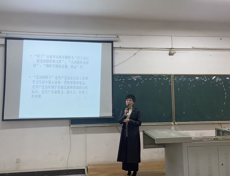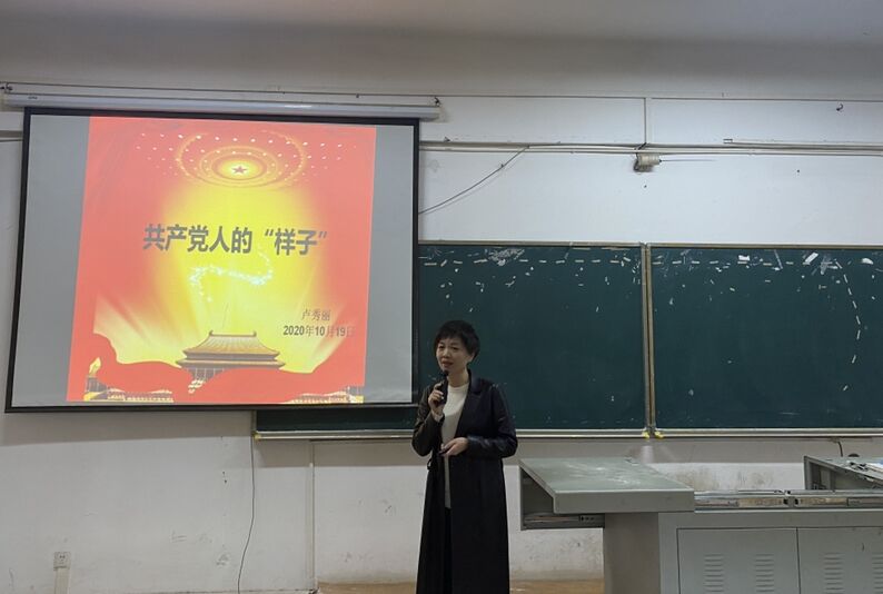 接着,卢秀丽阐述了中国艰苦卓绝的过往,回顾了辽沈战役里先辈烈士们身为党员的光辉事例,向学员们介绍替党分忧,勇挑重担的党员形象,强调党员要“一言一行体现党性修养,一招一式展现党员风采,一点一滴做出党员样子”。随后对所有青年学生提出要“有首有尾有担当,跟雨伞学做人,跟雨靴学做事”,老师结合自身经历向同学们分享,鼓励大家多阅读毛概、有关党性书籍。最后,卢秀丽举例了当代优秀党员的光荣事迹,如汶川大地震中的党员,他们用自己实实在在的作为,实实在在的示范,生动地展示了新时代共产党员的样子。卢秀丽借习近平总书记的语录,为所有学员树立正确的党员意识。