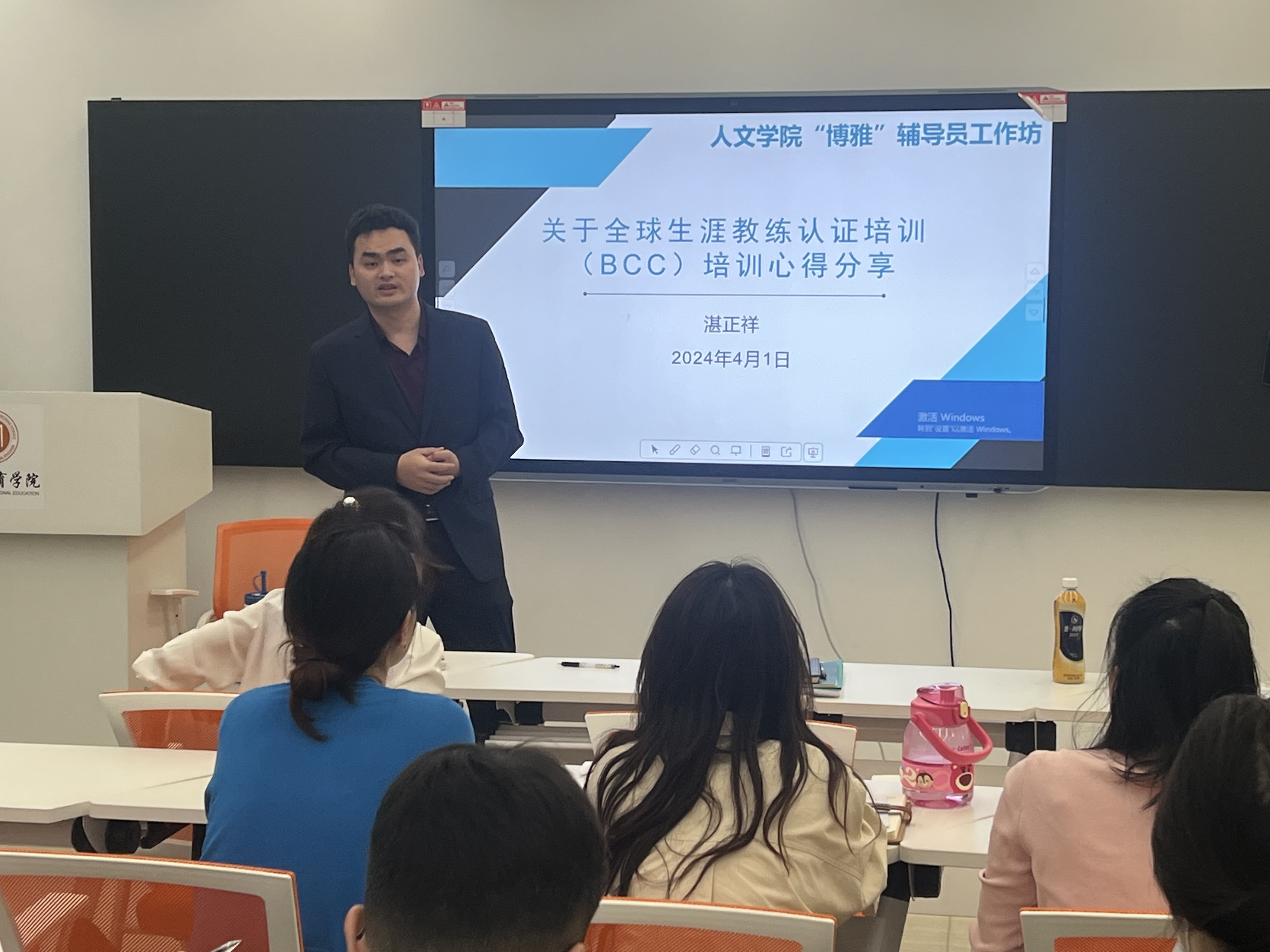 本网讯 (通讯员 吴靖)为进一步提升学院辅导员职业能力,为学生生涯规划提供更加专业的指导,帮助学生更好地解决各类问题,4月1日下午,人文学院召开“全球生涯教练认证“培训”会。人文学院党总支书记湛正祥为全体辅导员授课。