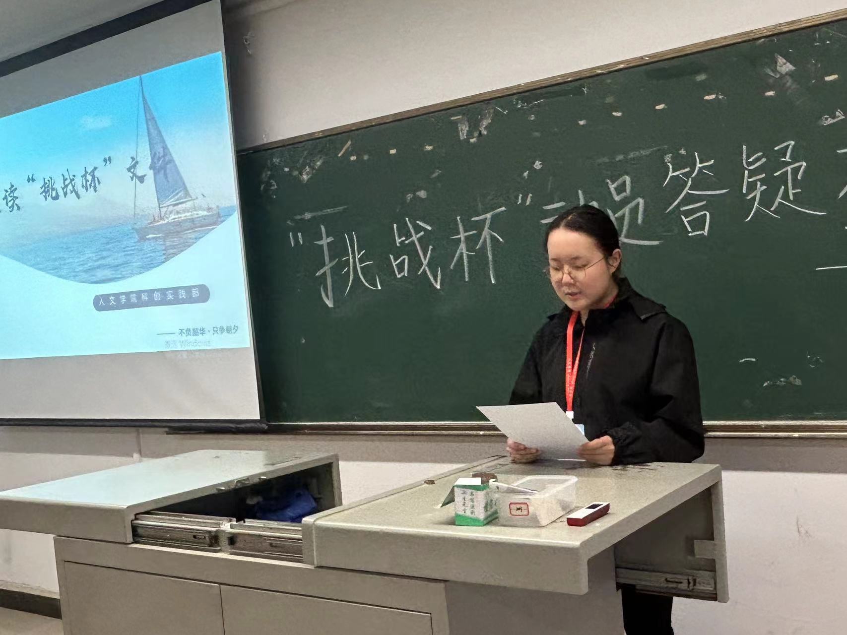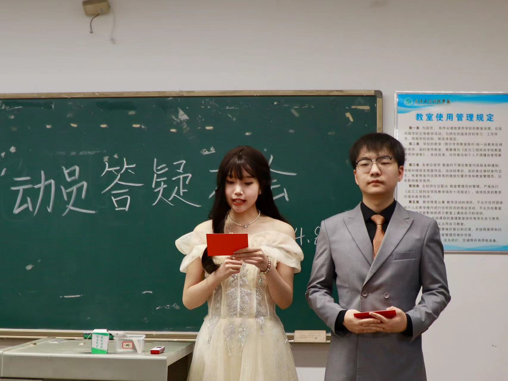 在答疑时间,大家自由提问,学长廖烺和学姐蔡琳对问题一一进行解答。他们讲解了“挑战杯”的相关事宜并提出注意事项,预祝大家能在比赛中取得好成绩。
