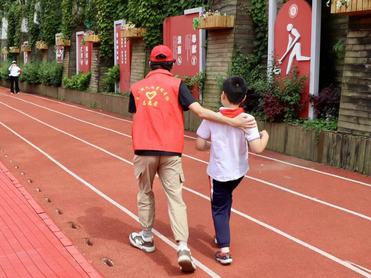 比赛开始时,人文志愿者们陆续到达各自负责的区域积极开展工作。他们顶着烈日,坚守岗位,为特殊儿童加油呐喊,积极引导孩子们向终点迈进,用热情和耐心践行志愿工作,发扬服务队“奉献、友爱、互助、进步”的精神,为运动会传递温暖。