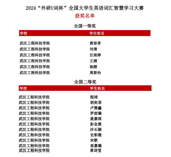 本网讯(通讯员 王芳 王莹)词海扬帆,智慧领航。近日,由外语教学与研究出版社主办的首届“外研U词杯”全国大学生英语词汇智慧学习大赛落下帷幕,经过竞赛激烈的角逐,我校共56名学生取得优异成绩,黄娈菲、刘倩、汪雨婷、王婧、徐颜、周斯怡6人荣获全国一等奖;程琦、胡奕菲等11名学生荣获全国二等奖;姚卫彤、陈丹丹等39名学生全国三等奖。