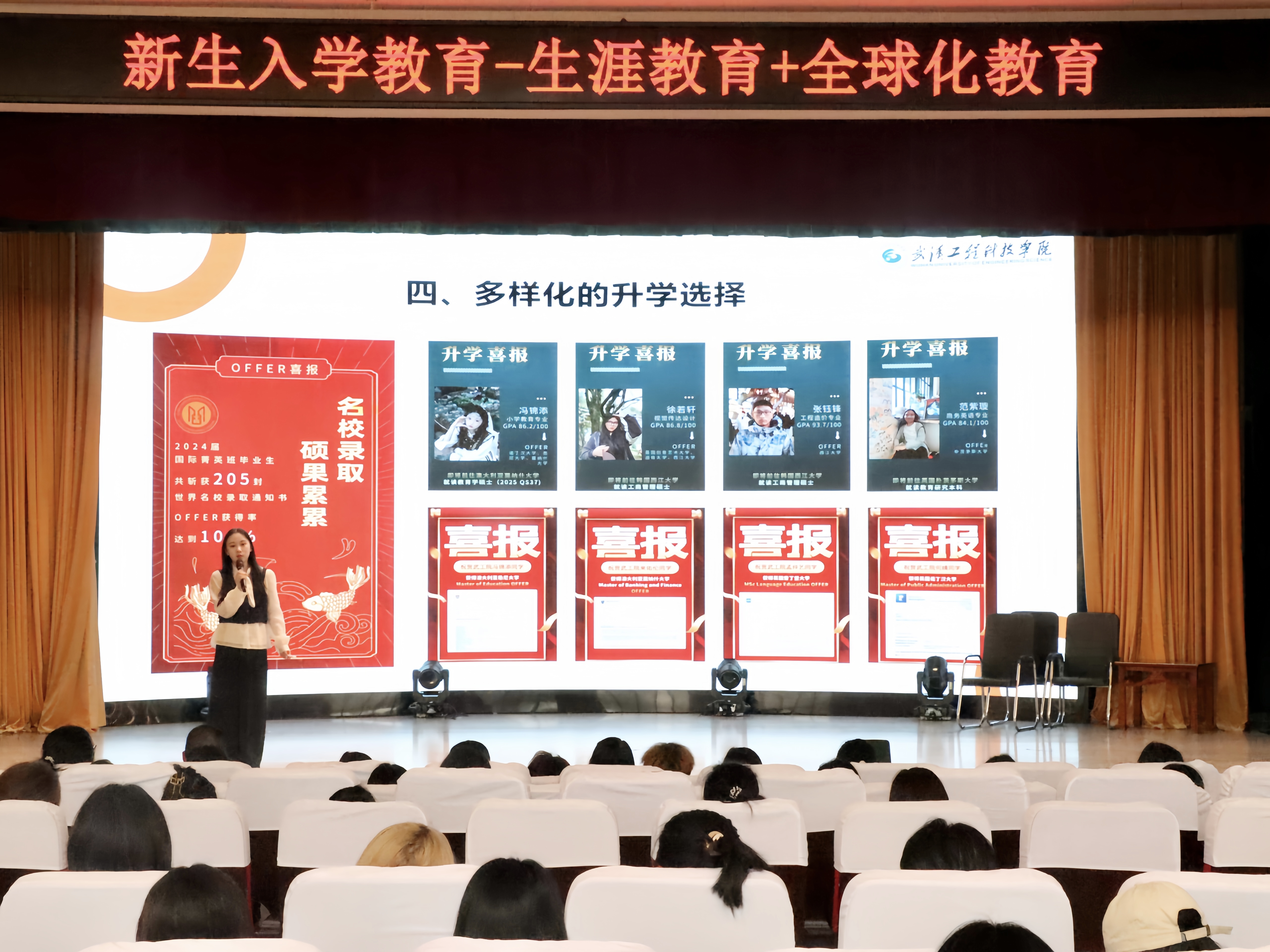 紧接着,国际教育学院教师王笑语为新生开展全球化教育。她首先向新生们介绍了自己国际化的教育经历和职业生涯,呼吁新生们提前准备,从现在开始规划自己的学业和职业生涯。她强调,无论是求职还是深造,学历都是不可或缺的敲门砖,并通过详细的数据分析,对比了国内考研与出国读研的异同,为同学们提供了宝贵的参考信息。她指出,国际教育学院可以为学生提供一个全球化的教育平台,通过国际实验班这一创新人才培养模式,帮助学生们提升认知、开阔视野、提升人生格局。国际实验班的双导师制度、小班教学、丰富活动以及小语种课程等特色,都旨在为学生们打造一个全方位、多层次的学习环境,学生们还可以享受到优质的国际化活动,与海外名师、学术大咖、行业大咖等进行交流,助力自身更好地适应未来社会的挑战。