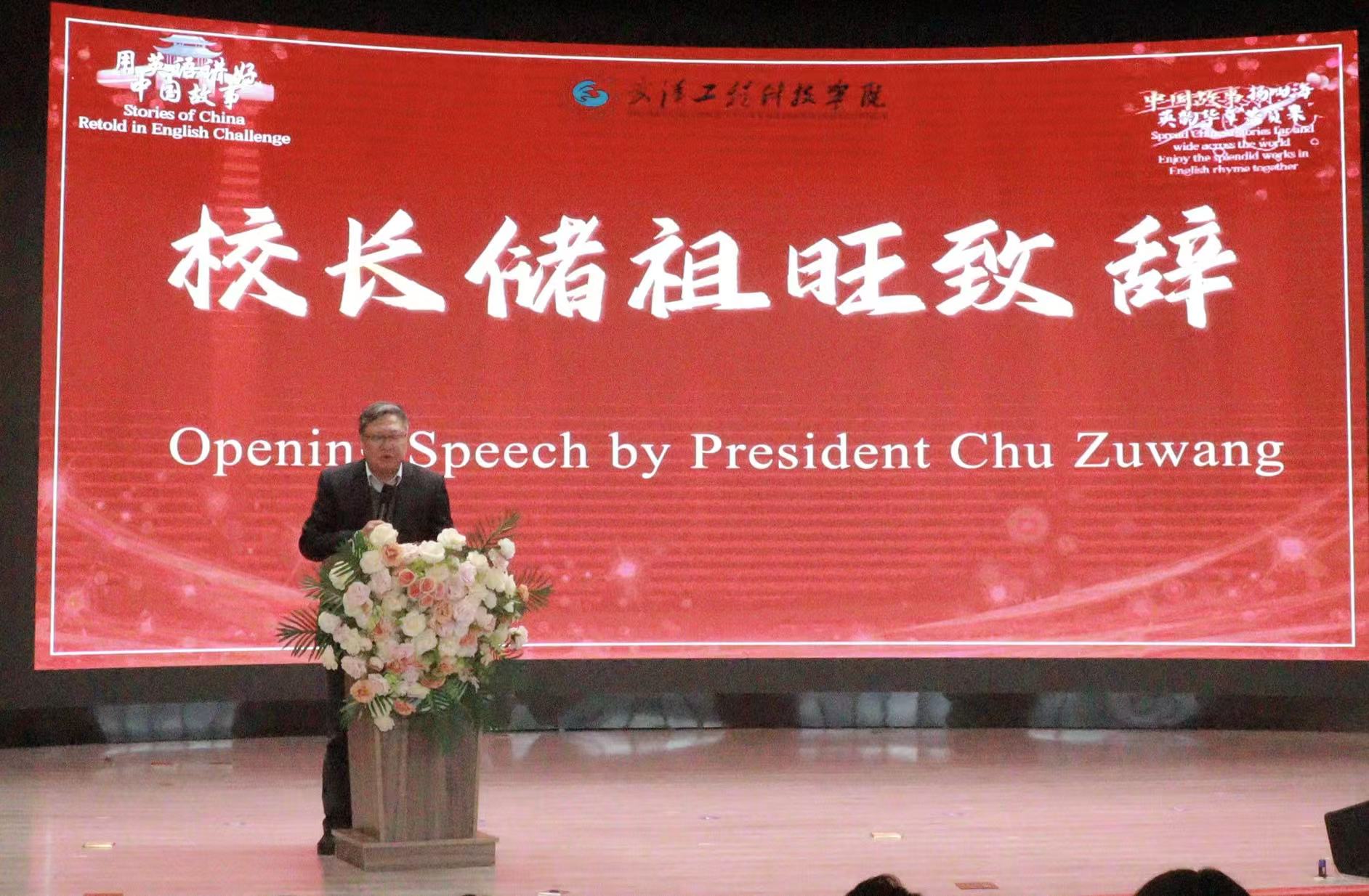 校长储祖旺发表致辞,他表示面对百年未有之大变局,用英语讲好中国故事是新时代赋予大学生的责任。学校在“全球化、高端化、个性化”的教育之路上,始终致力于培养具有全球视野、跨文化交流能力的优秀人才,致力于推动中华文化走出去,以文载道、以文传声、以文化人,向世界阐释推介更多具有中国特色、体现中国精神、蕴藏中国智慧的中国故事。同时,储校长希望参赛选手们学会运用国际化的表达方式,把中国故事和世界文化巧妙融合在一起,探寻共鸣之处,让世界看见真实的、全面的、立体的中国,感受中国文化的传统魅力,为世界文化的多元共生贡献中国力量。最后储校长希望参赛选手们能展示武工院学子的立德、博学、笃行、创新的精神风气,凭借着对中国故事的深刻理解和出色的英语表达能力,在比赛中斩获佳绩!