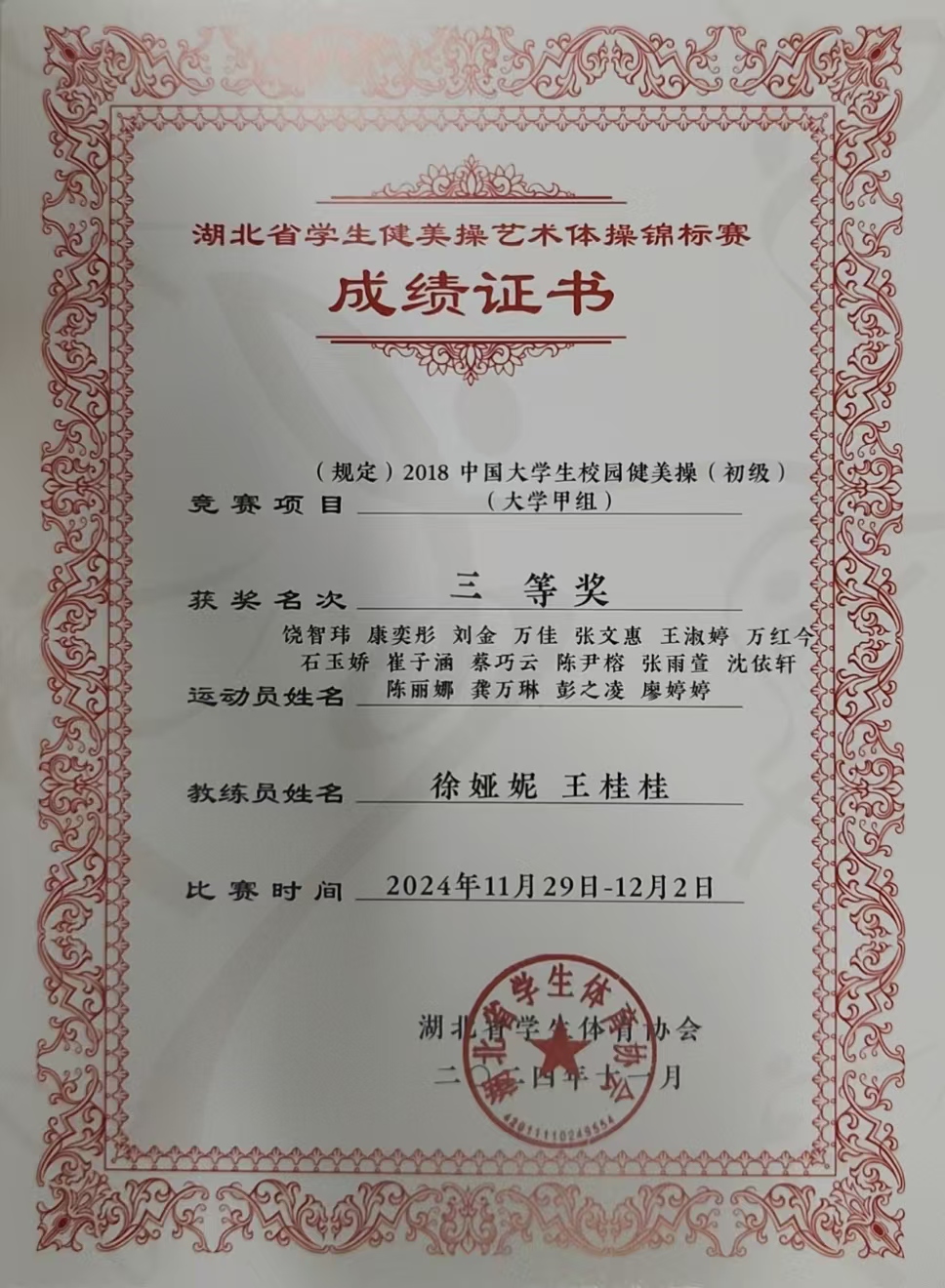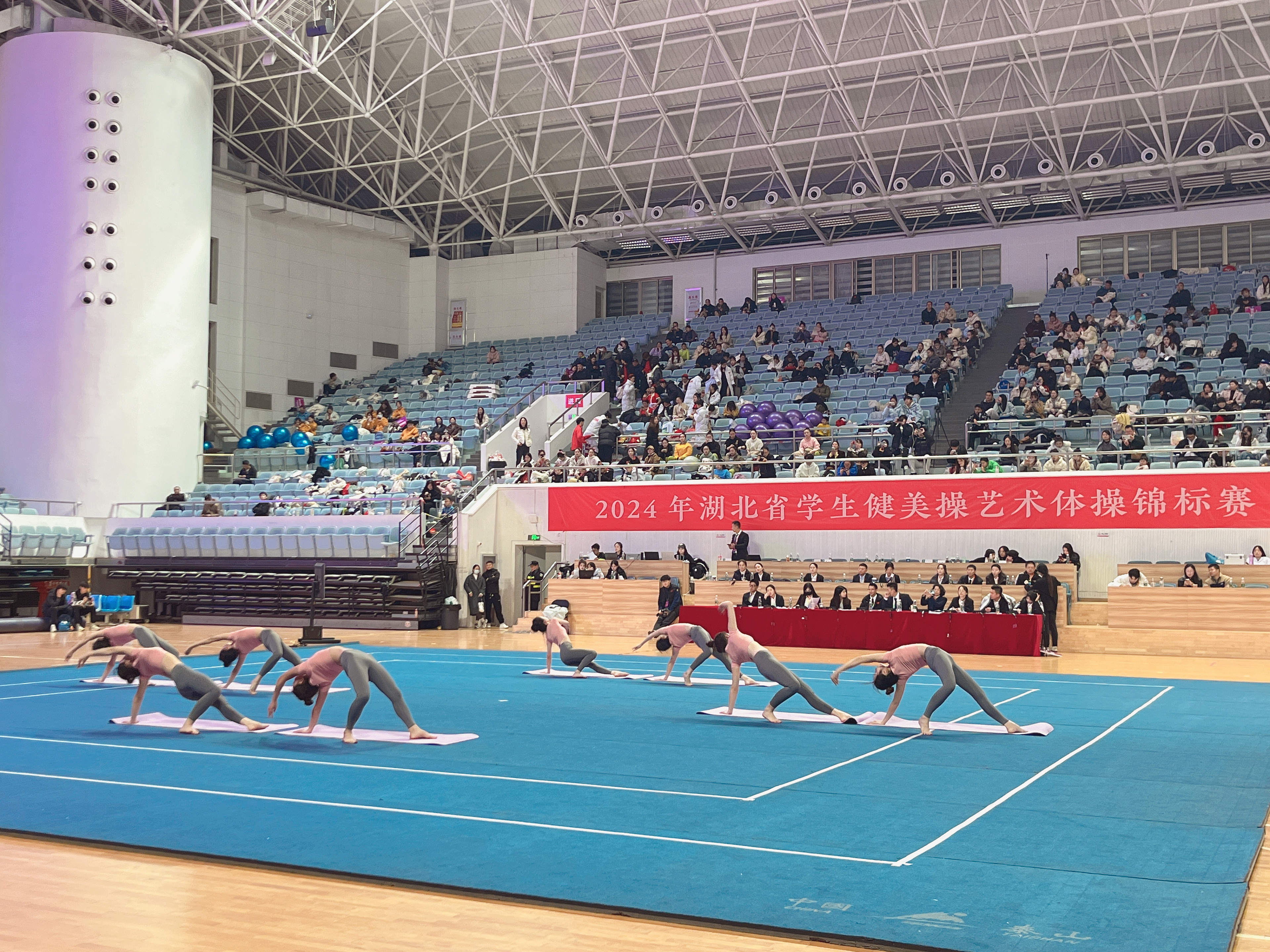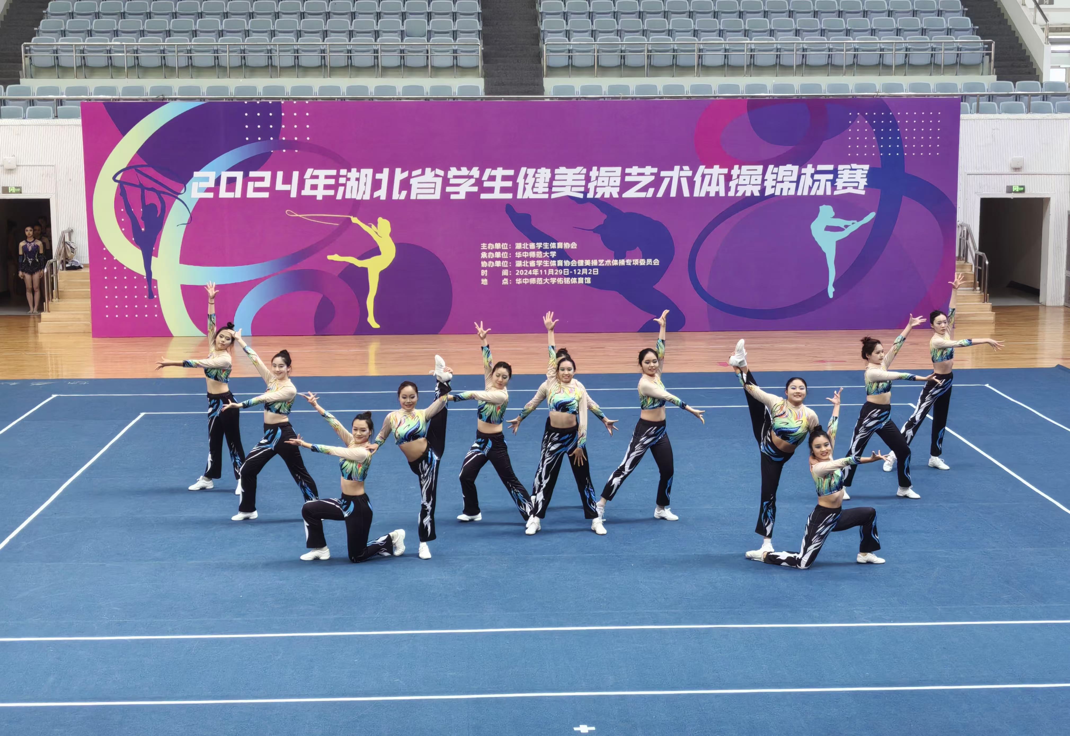 本网讯(通讯员:徐娅妮)11月29日—12月1日,由湖北省大学生体育协会主办,华中师范大学承办,湖北省大学生体育协会健美操艺术体操专项委员会协办的2024年湖北省大学生健美操艺术体操锦标赛在华中师范大学佑铭体育馆成功举办。本次比赛吸引了来自全省38所高校,60支队伍,987名运动员参加比赛。我校40名学生在高昆、张学芬,教练员宋英、王桂桂、徐娅妮、万丽芳6位老师的带领下参加本次比赛的四个项目。获得1个一等奖,3个三等奖的好成绩。