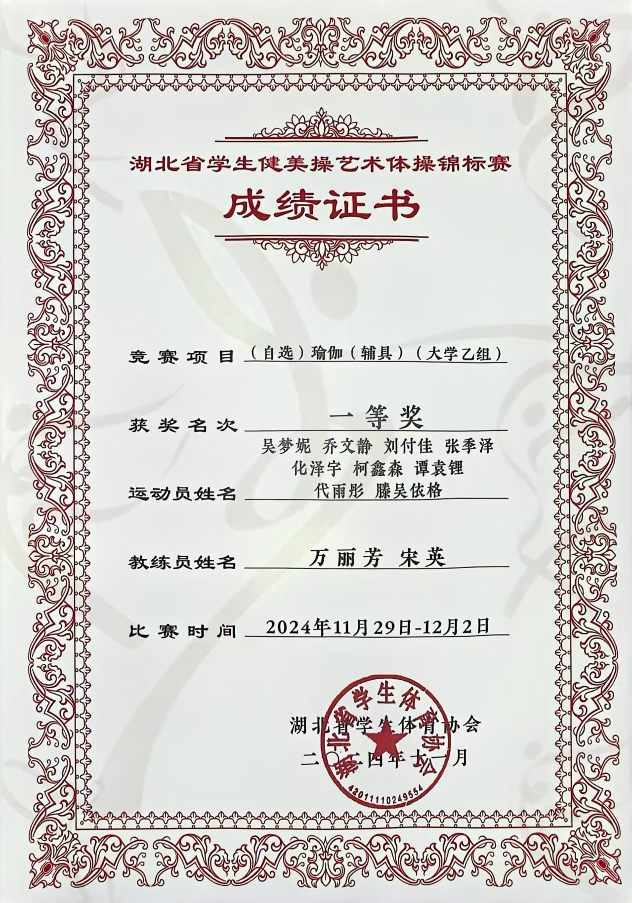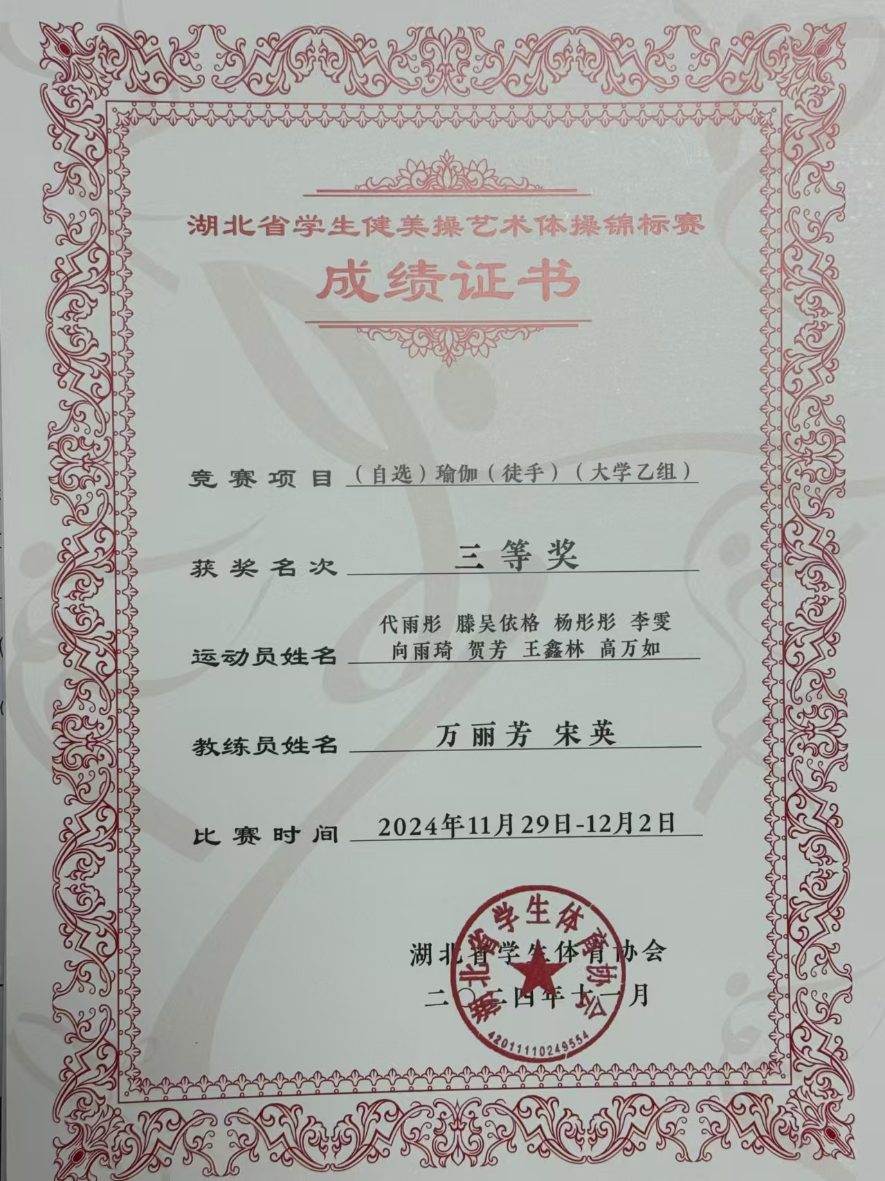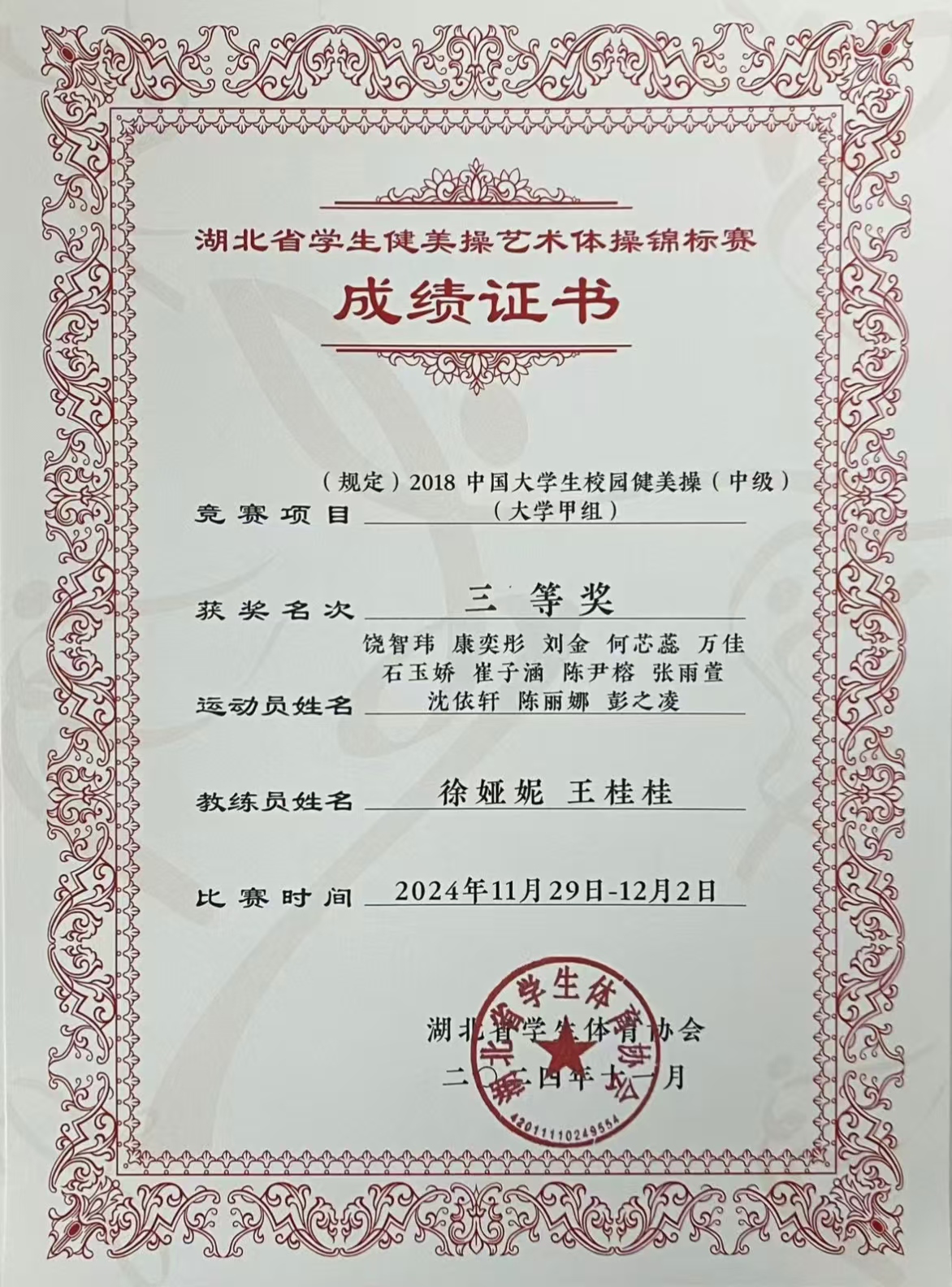 本网讯(通讯员:徐娅妮)11月29日—12月1日,由湖北省大学生体育协会主办,华中师范大学承办,湖北省大学生体育协会健美操艺术体操专项委员会协办的2024年湖北省大学生健美操艺术体操锦标赛在华中师范大学佑铭体育馆成功举办。本次比赛吸引了来自全省38所高校,60支队伍,987名运动员参加比赛。我校40名学生在高昆、张学芬,教练员宋英、王桂桂、徐娅妮、万丽芳6位老师的带领下参加本次比赛的四个项目。获得1个一等奖,3个三等奖的好成绩。