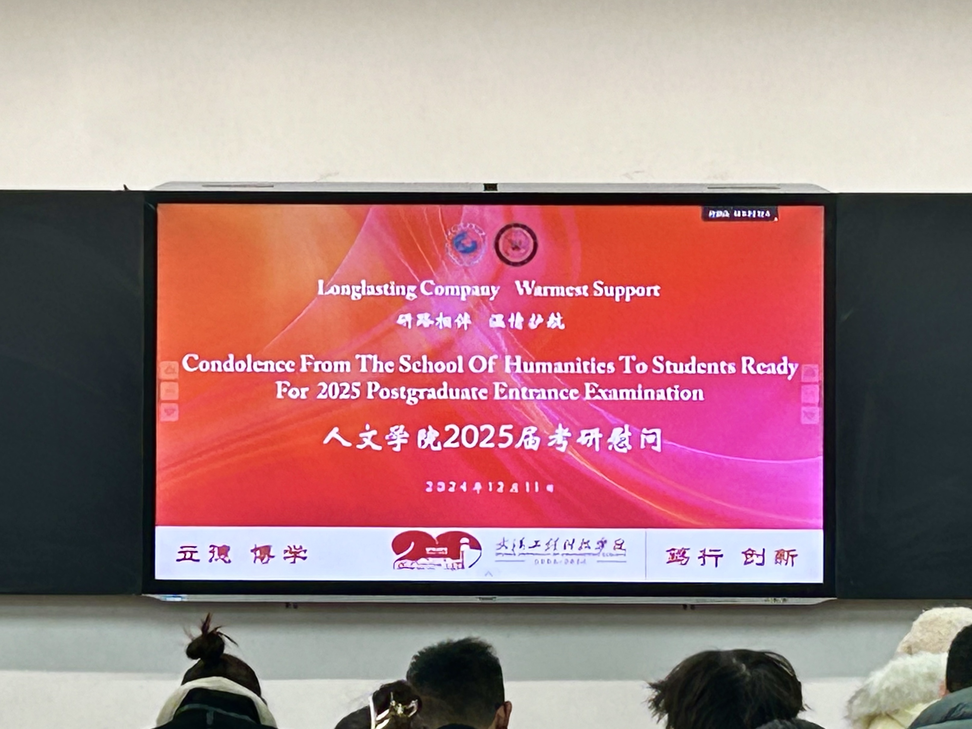 本网讯(通讯员 莫晶晶 李姝涵 余珍珠) 2025年考研将至,为了给即将踏上考研战场的学子们送上最真挚的关怀与祝福,帮助他们缓解压力,增强信心,12月11日,人文学院于四号教学楼104室开展2025届考研慰问活动。人文学院院长吴亚林,人文学院党总支书记张冬琦,人文学院教学副院长吴海燕,人文学院实践教学副院长郭生鼎,人文学院团总支书记郭孟言及毕业班辅导员们为即将参加考研的学子们送上关怀与祝福。