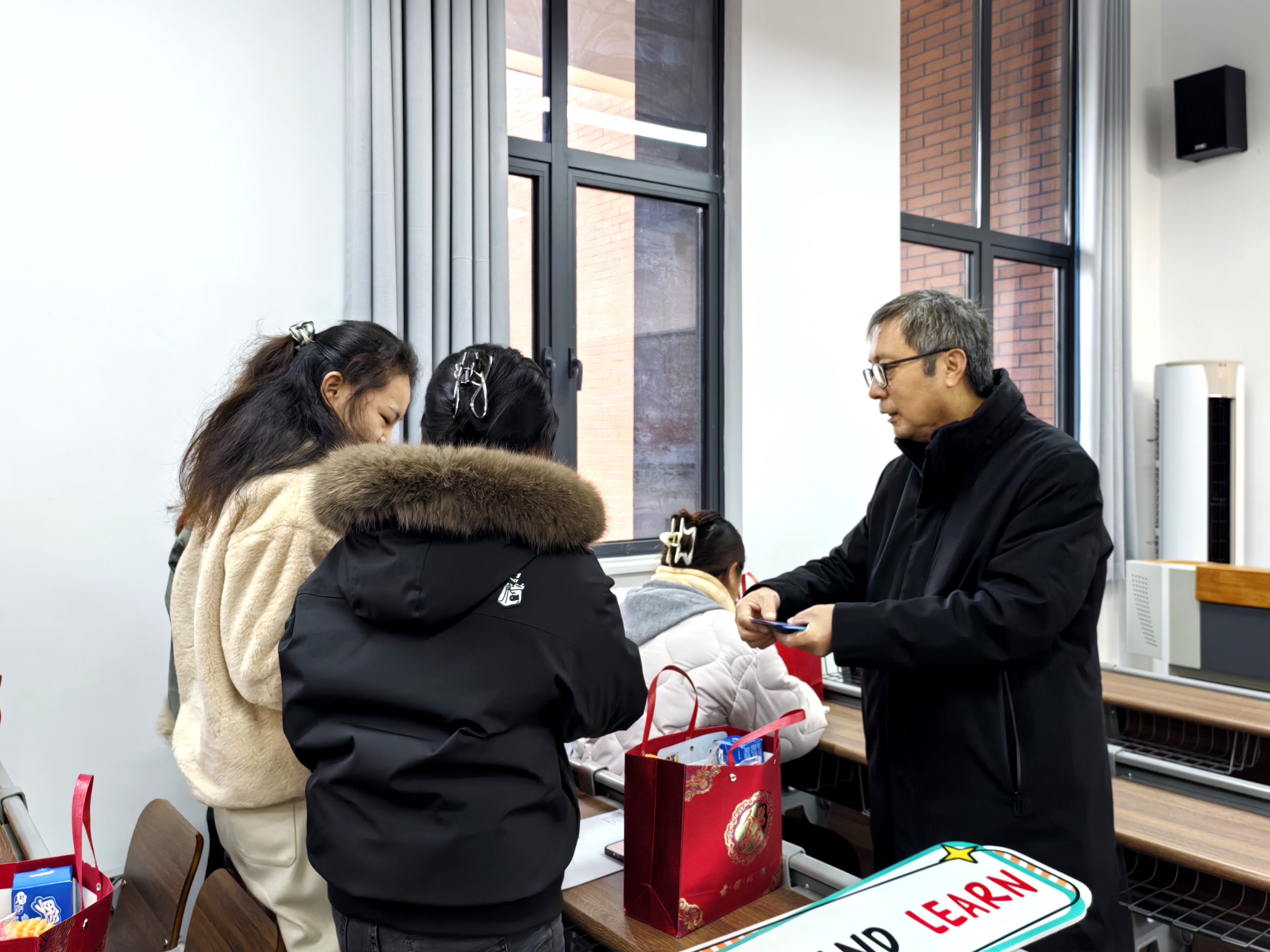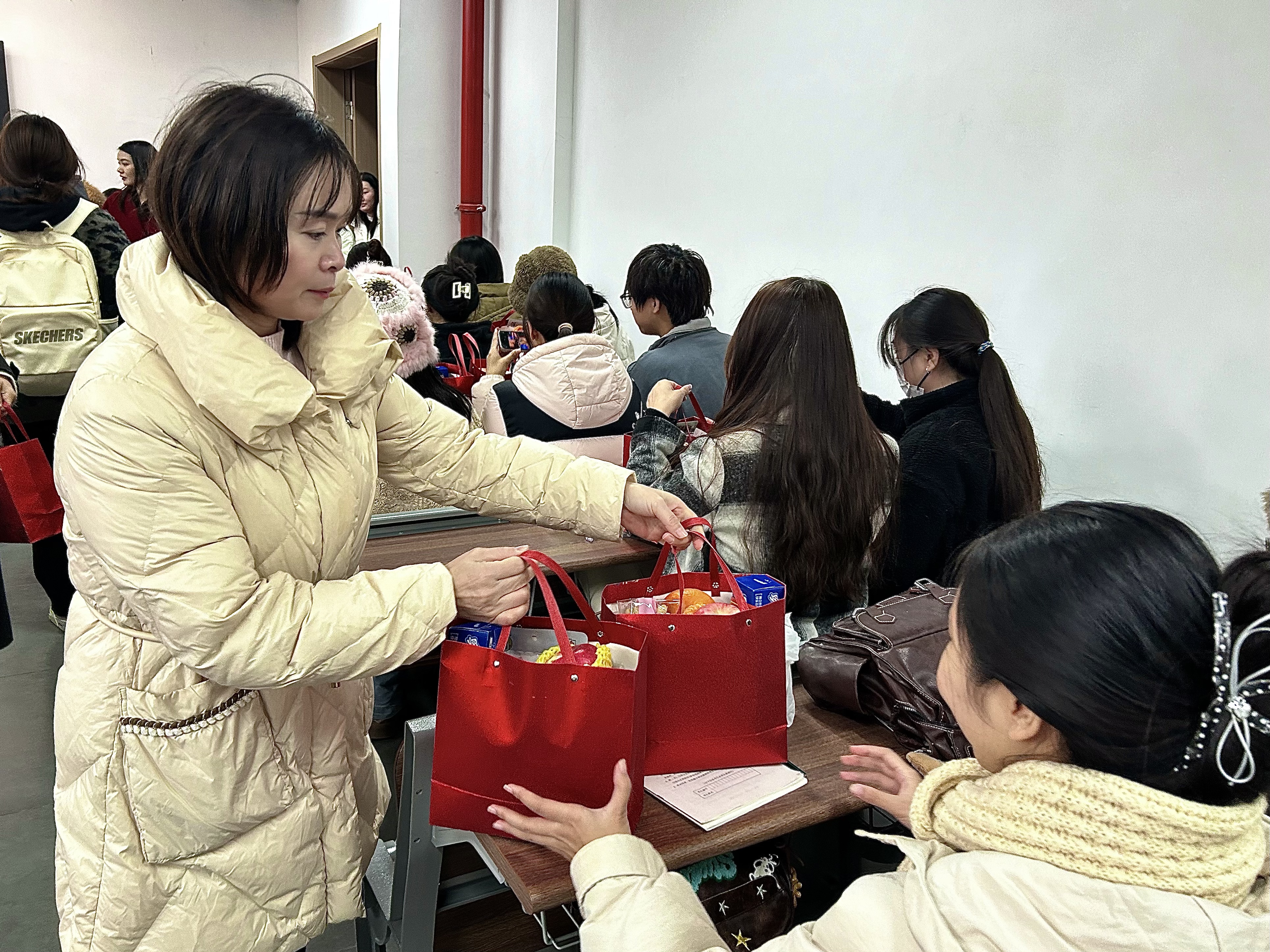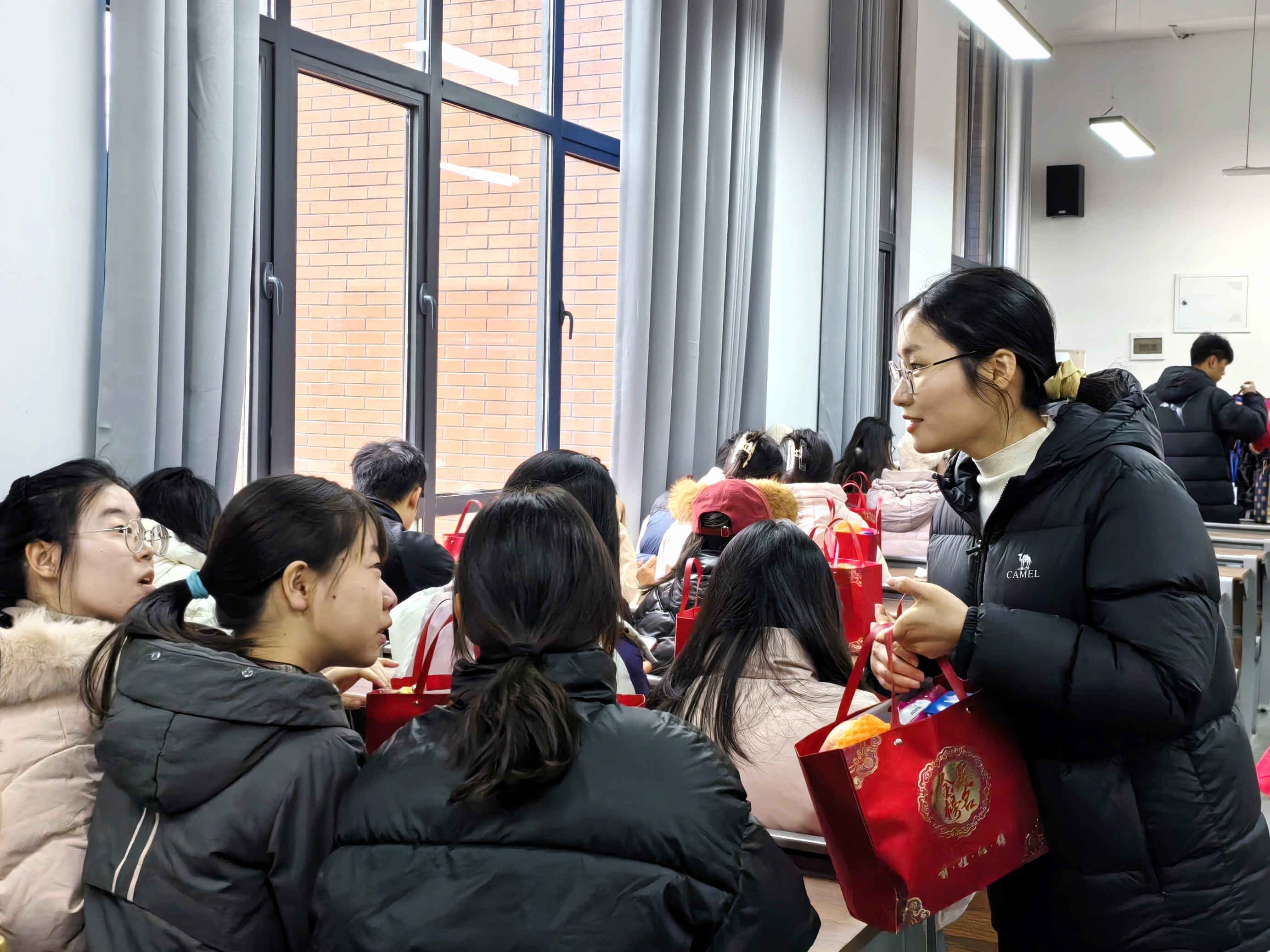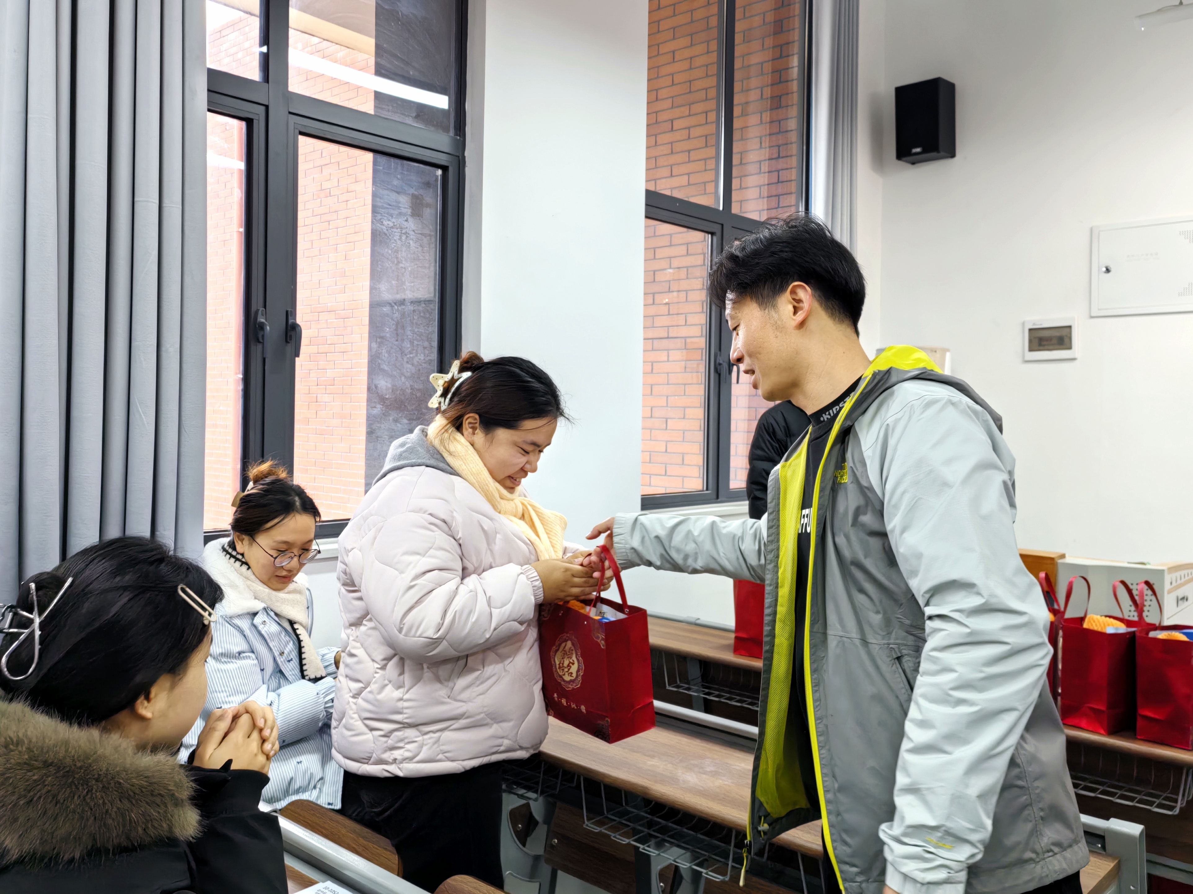 随后,人文学院开展慰问活动。各领导与辅导员为考研学子们一一送上学校精心准备的“金榜题名”礼包,礼包内容丰富,寓意“一举夺魁”的向日葵瓜子,寓意“好事发生”的花生,寓意“心想事成”的橙子……沉甸甸的礼包寄托了学院对考研学子的热切期望与关爱。