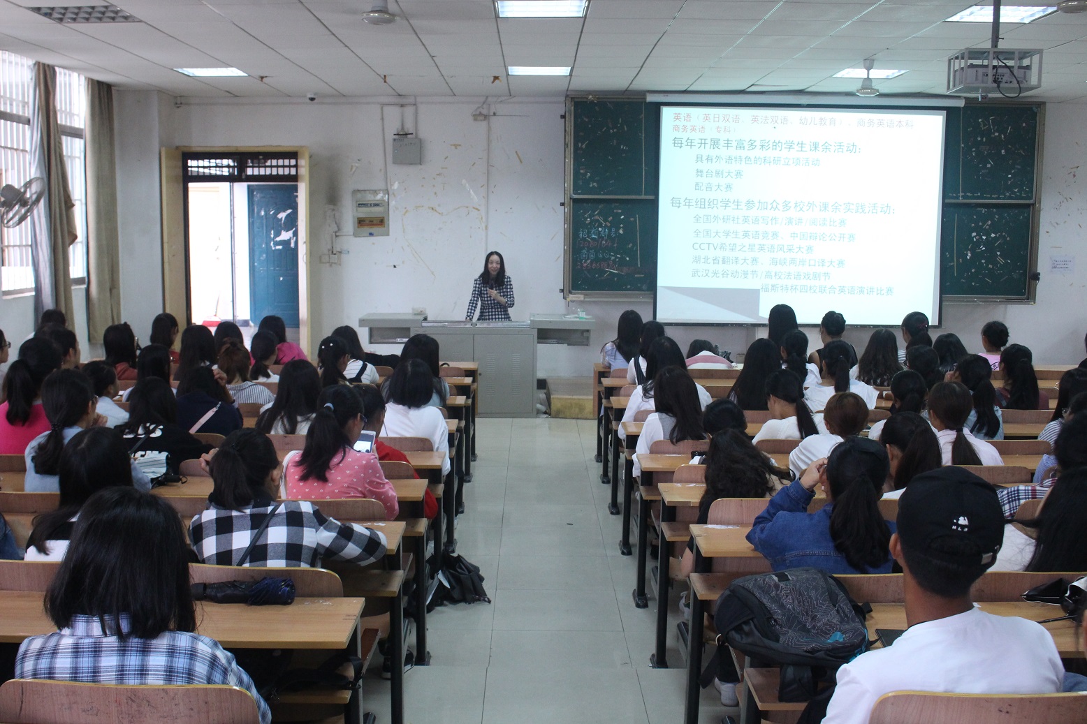 (通讯员阮梦丽、赵榕报道)2017年9月27日上午9:50,外国语学院、航空学院在第一教学楼115教室开展了关于我院专业介绍的讲座,外国语学院英语专业教研室主任罗莉担任本次讲座的主讲人,特邀嘉宾为外国语学院、航空学院院长冯光华教授以及党总支书记陈扬副教授。