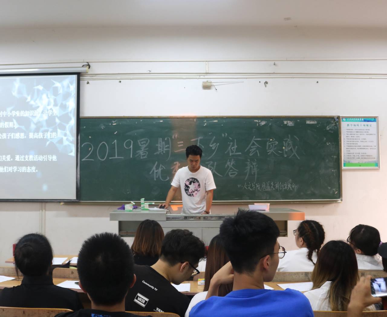 本网讯 (通讯员 张扬 唐蓉)为了检验三下乡社会实践开展的情况,人文学院于 2019年9月26日17:30在一号教学楼401教室开展2019年暑期“三下乡”社会实践优秀团队答辩会,学院团总支书记李英、全体辅导员、团总支学生会主席团成员及参与答辩的四支团队悉数到场参会。