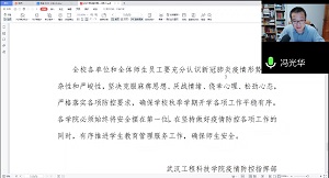 会议伊始,院长冯光华传达了学校新冠肺炎疫情防控指挥部的有关文件精神,他指出老师们要积极坚持每日健康检测,落实“日报告”“零报告”制度,切实加强健康防护。及时制定线上线下混合教育预案。随后,卢潘书记就学校开学的时间、返校入校的流程提出要求,他强调低风险地区且14天内无中高风险地区旅居史的教职工返校时需要向学校出示48小时内的核酸检测报告、健康绿码和大数据行程卡,提前做好开学前的准备,暂不能返校的需提前履行请假审批手续。
