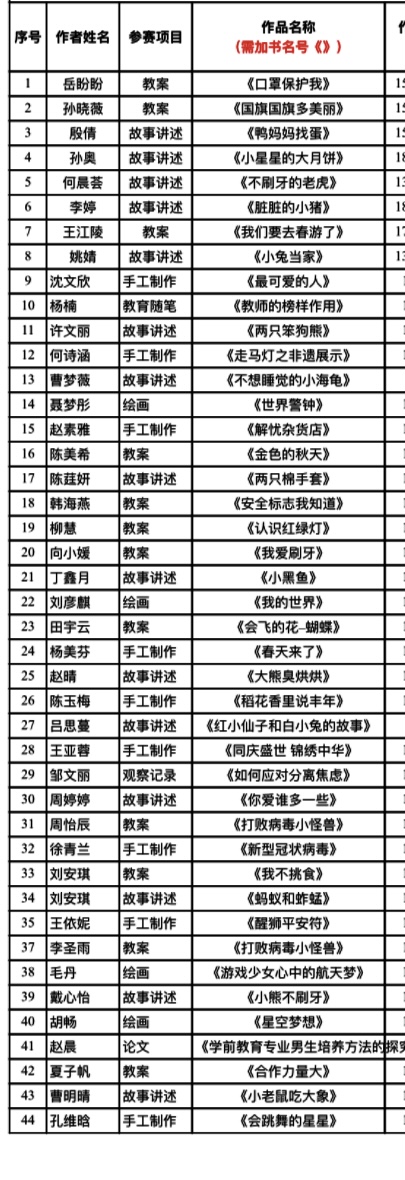 本网讯(通讯员 李霞)2021年11月,第十九届“当代杯”全国幼儿教师职业技能大赛正如火如荼的开展。我校学前教育专业教研室积极组织、指导学前教育专业、小学教育专业等学生参加比赛,共计投送教案活动设计、教学观察记录、论文、手工作品、绘画、故事讲述等作品40余份。