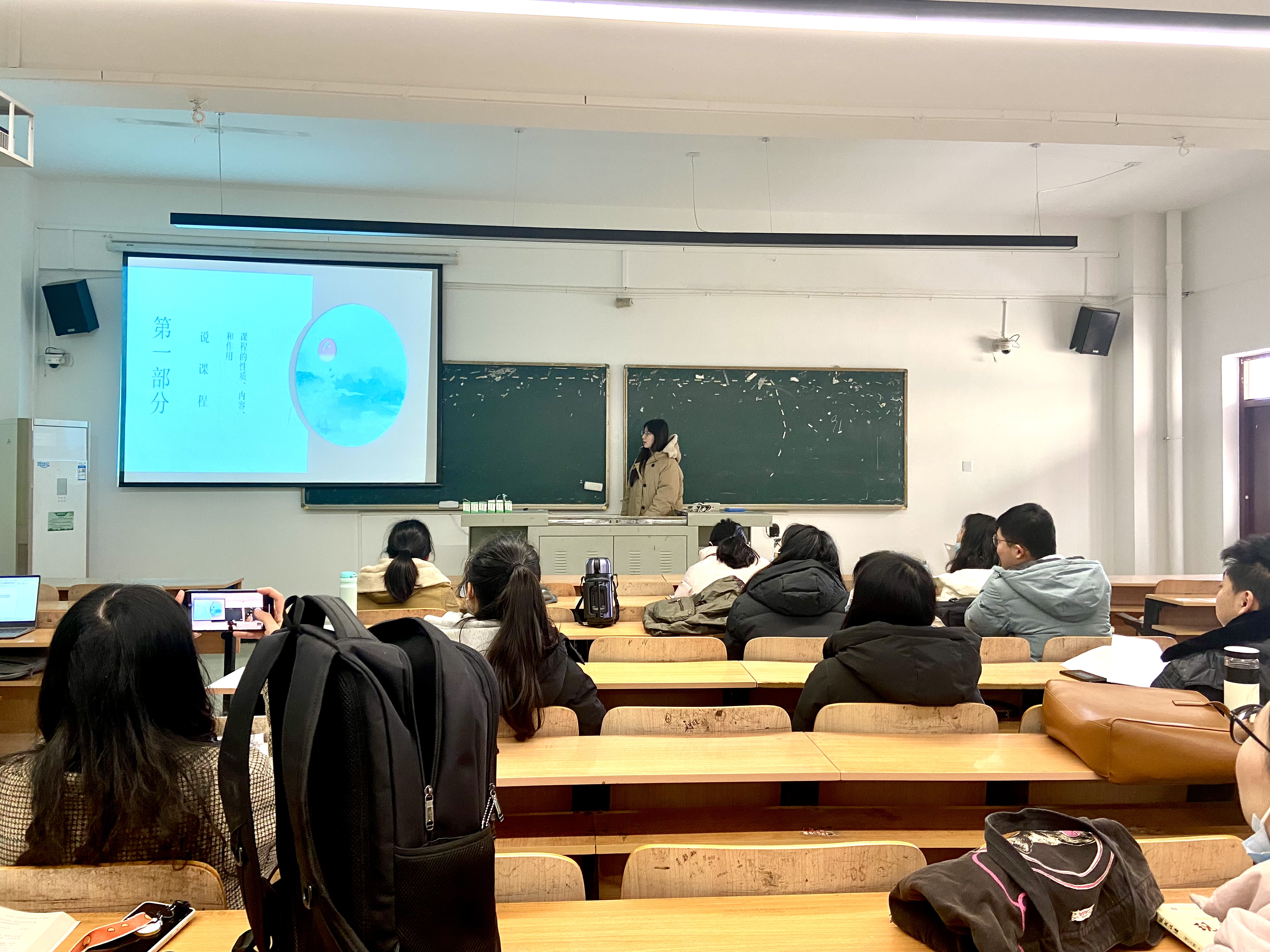 此外,为响应教育部对课程思政的重视,此次说课活动中教师们也共同探讨了不同课程如何进行思政教学。如曾慧教授表示在学习《古代文学》课程的过程中可以让学生在苏轼身上体会并学习他旷达洒脱的胸襟和处世态度;章霜老师则表示文学类课程也可以让学生了解到我国文学作品在海外传播境况,以此建立学生的文化自信。
