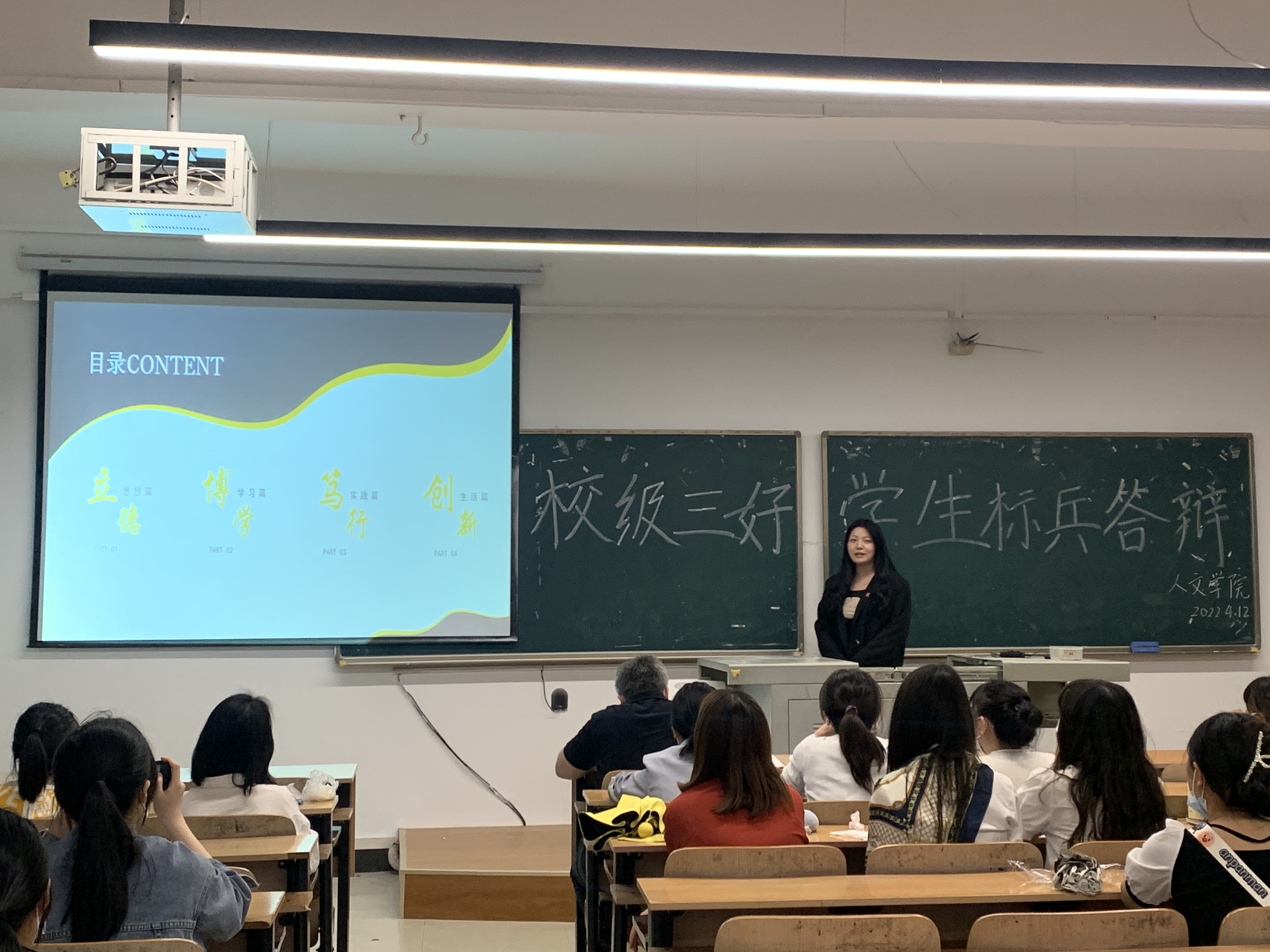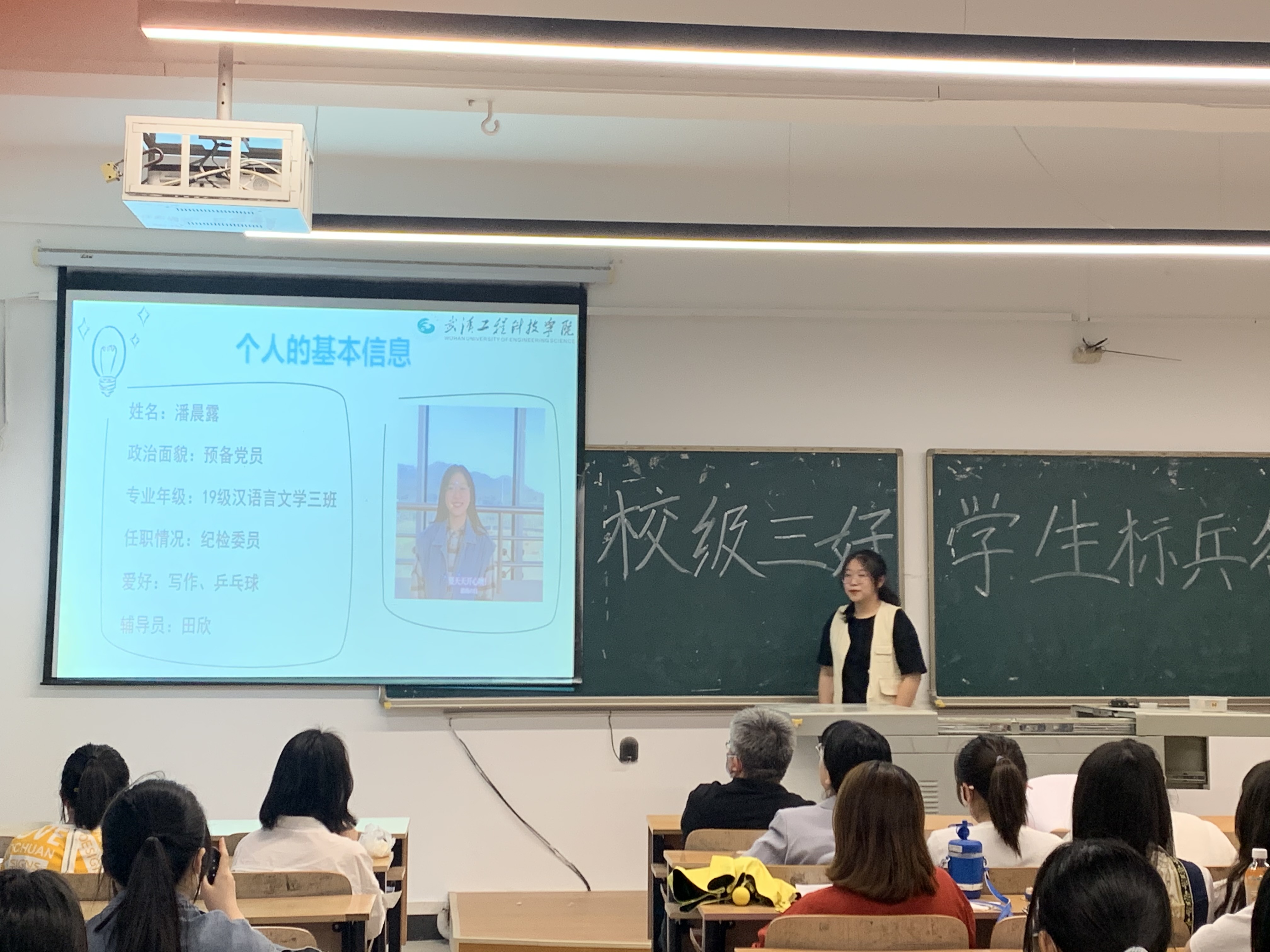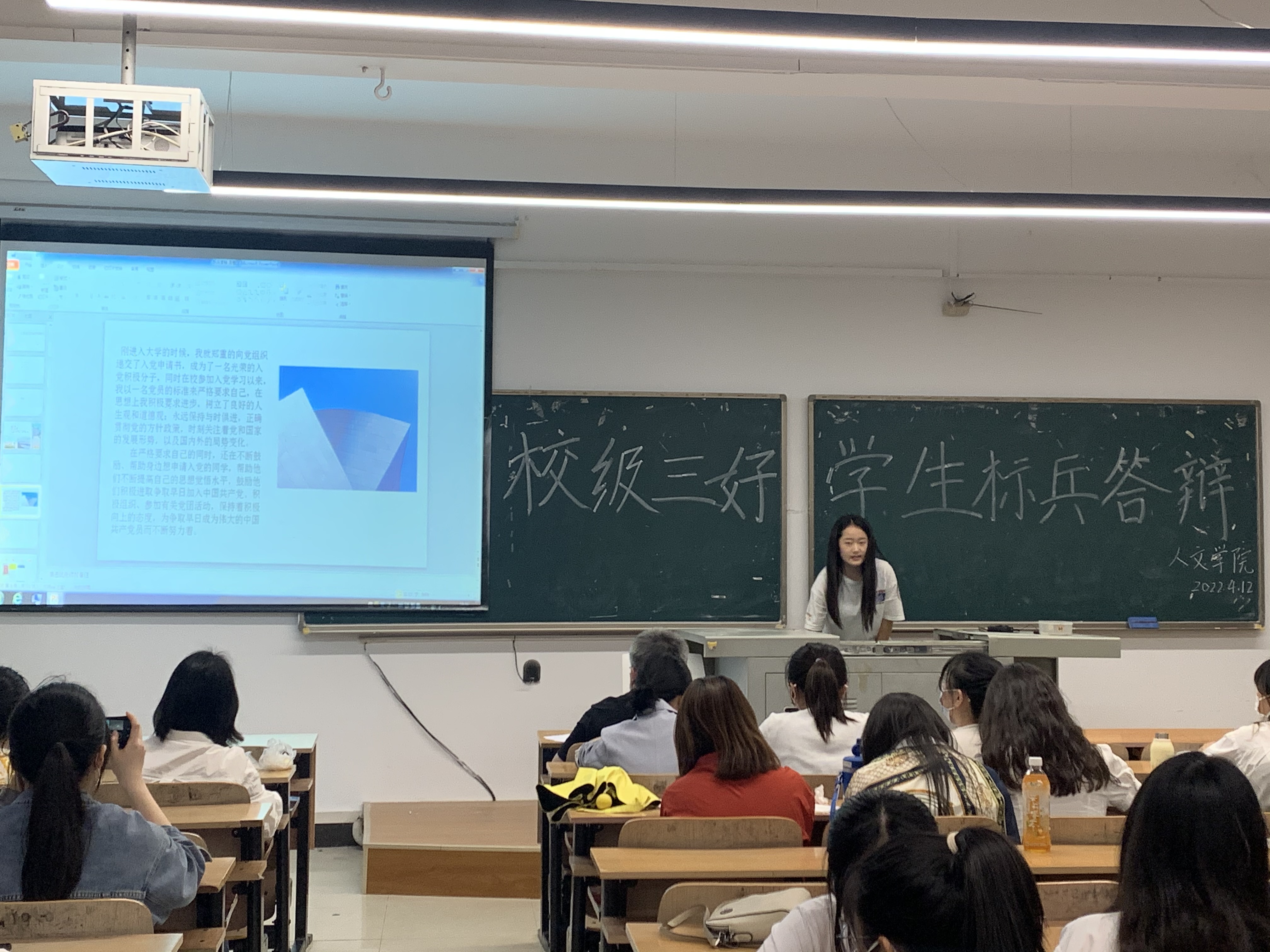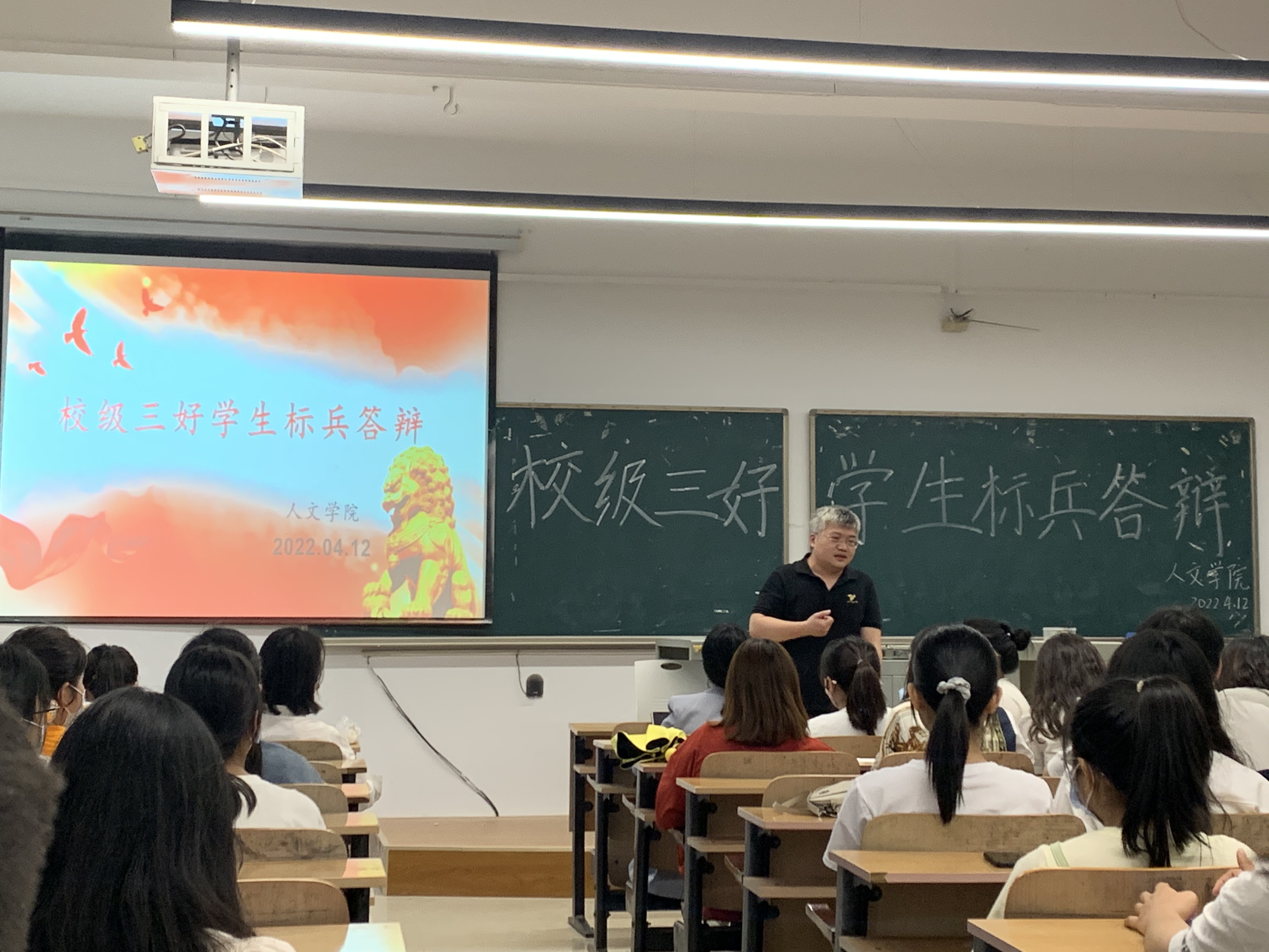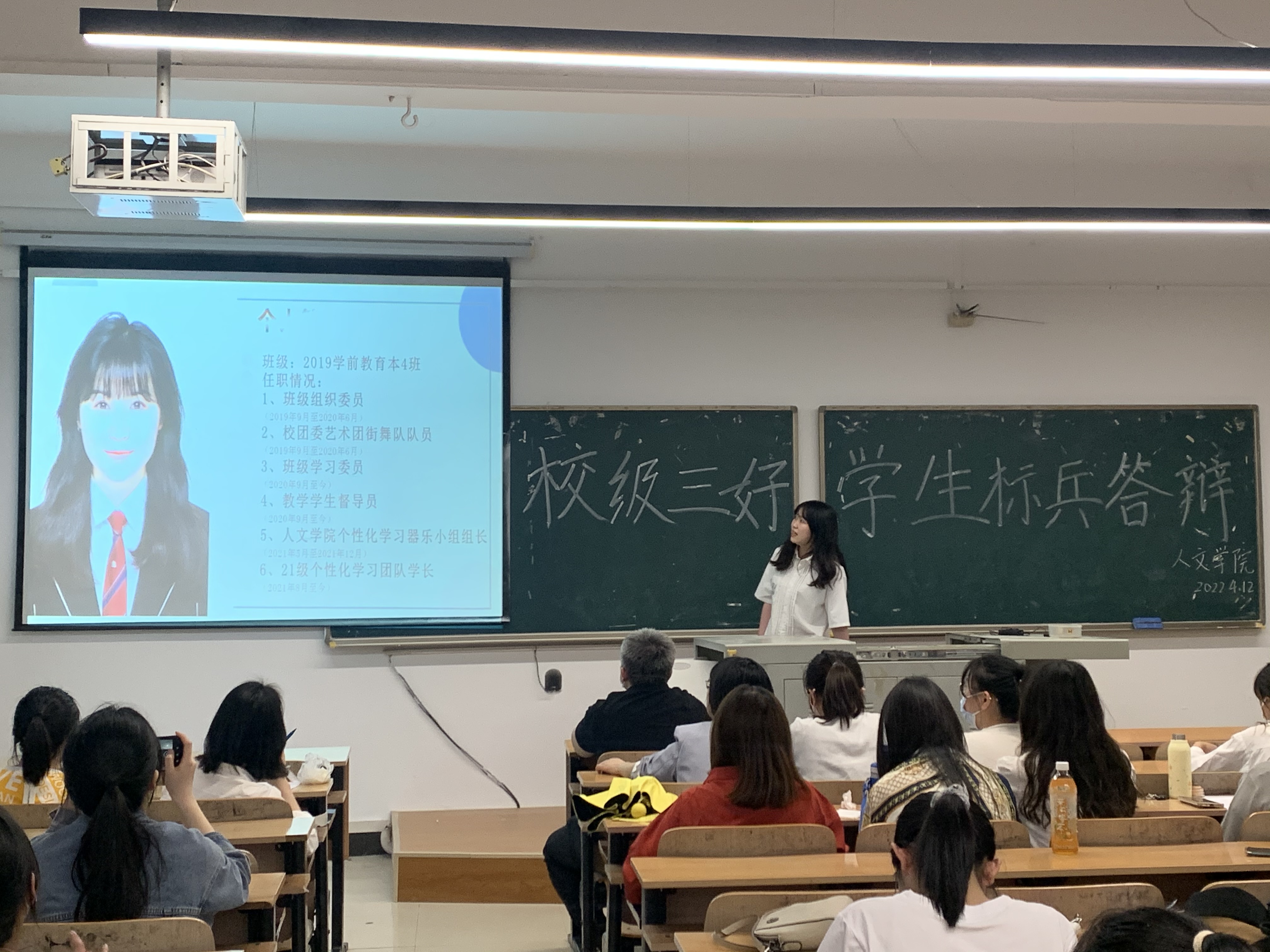 本网讯(通讯员 蔡晓庆 杨昕瑀)为加强学风建设,树立良好的学习榜样,保证学院评奖评优工作公开、公平、公正,2022年4月12日,武汉工程科技学院人文学院校级三好学生标兵答辩会在学校一号教学楼301教室开展。人文学院党总支书记卢潘出席了本次答辩会,人文学院辅导员、14位竞选成员以及各年级学生代表参加了本次答辩会。受疫情影响,本次答辩会通过线上连线和线下展示的方式进行。