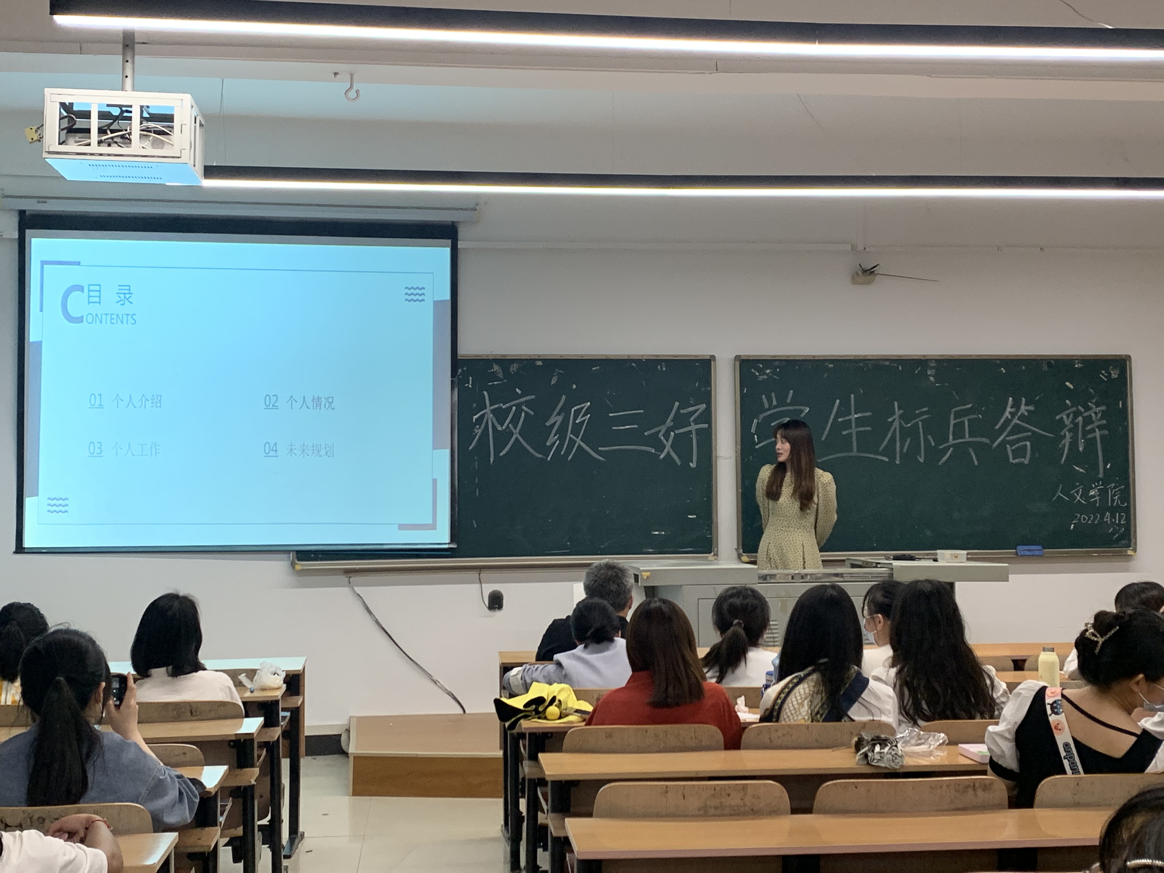 竞选人员结合演示文稿依次上台进行展示。他们从自我介绍、学习现状、学生工作、社会服务、思想态度、获奖情况、未来规划等方面展现自己的风貌。竞选人员首先进行了自我介绍,对自己的获奖情况和社会实践进行了回顾。他们积极参加竞赛活动和学术研究,踊跃投身于社会实践和抗疫志愿服务,精彩的汇报迎来了在场人员的阵阵掌声。