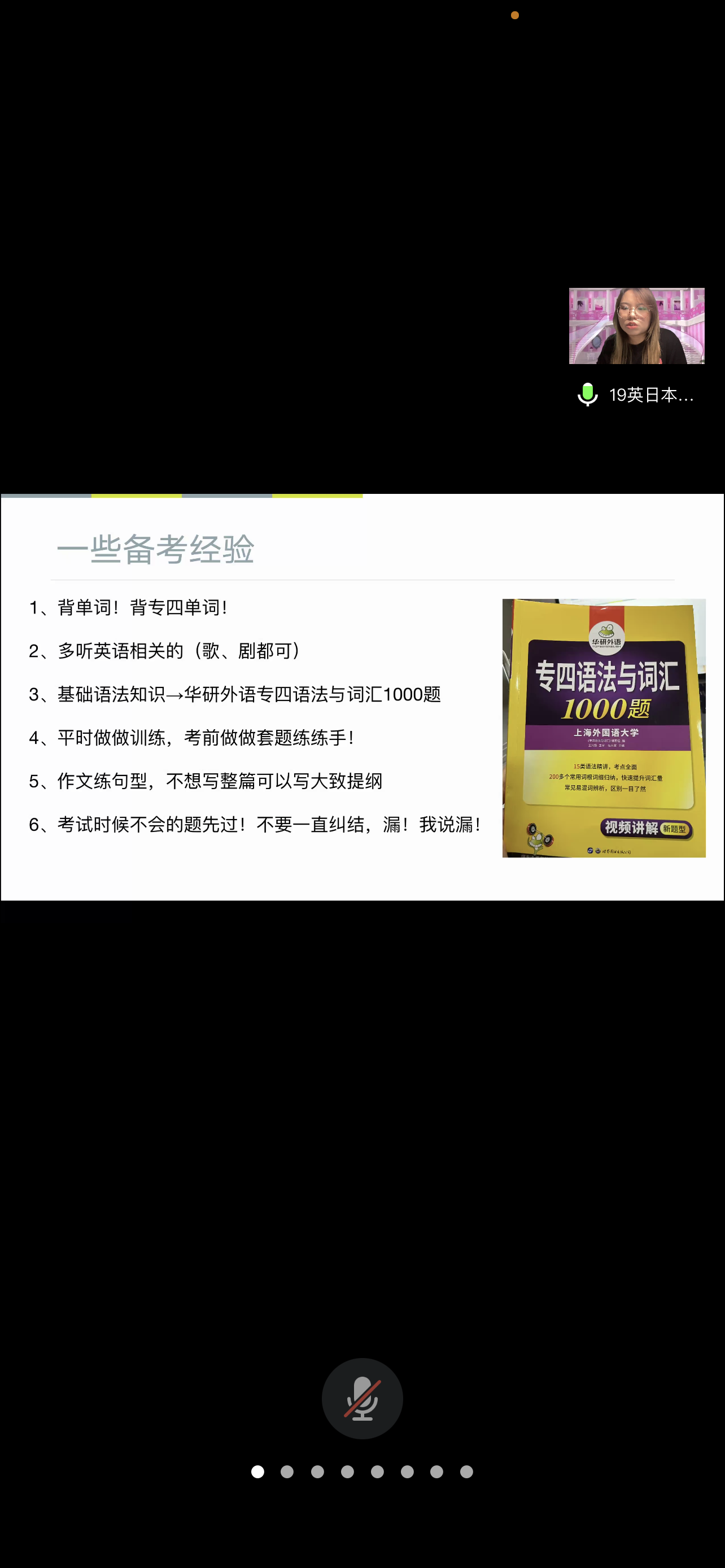 分享会上,两位学姐从自身的备考经验与学习方法出发,与同学们进行了经验分享和问题讨论。何泳从情绪管理、考试重要性、做题经验等方面与同学们进行了分享,在听力方面,她向大家推荐了喜马拉雅和美国之声两个平台,鼓励同学们多听多练。在做题方面,她提出了“找中心词”、“注意文章行文顺序”、“主旨题放最后”、“反复阅读”四个技巧。最后,她以“some days will always be harder than others.Be patient with yourself.”给同学们送上了美好祝愿。