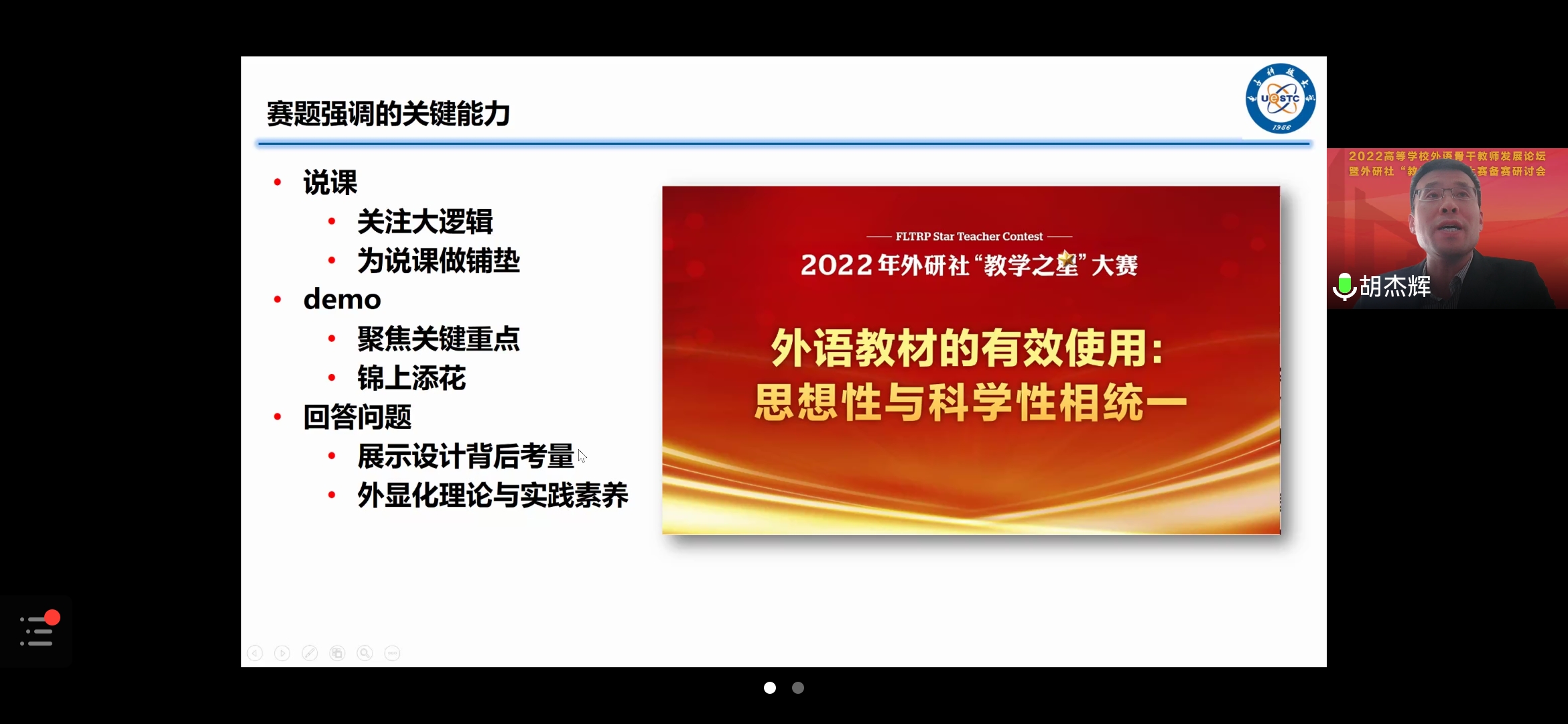 随后,教学团队成员集体观看由外研社主办的2022年“教学之星”大赛线上备赛研讨会。电子科技大学胡杰辉教授从赛题强调的关键能力、比赛展示的误区、教师教材的互动框架、以赛促学的提升策略四方面进行分享。论坛还邀请历年参赛优秀教师进行一线教学经验分享。