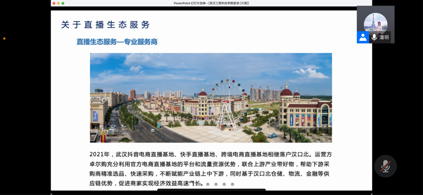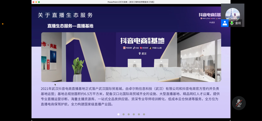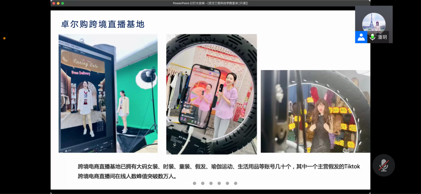 会议伊始,由潘玥向毕业生介绍企业背景及汉口北直播生态服务基本情况。卓尔智联通过“卓尔购”平台,构建跨境直播基地、快手直播基地、抖音直播等基地,开展了直播业务。接着,潘玥用镜头与图片直观的方式,展示卓尔企业的人才孵化计划、工作环境、住宿条件、往期实习案例、薪资条件以及卓尔购跨境直播基地相关产业类目。同时,她详细介绍了招聘的岗位职责、工作要求、薪酬水平等。潘玥运用行业就业前景分析,紧抓海外未被全面挖掘的市场和以及TikTok海外平台受众范围数据,鼓励毕业生积极参与跨境电商服务行业工作中。