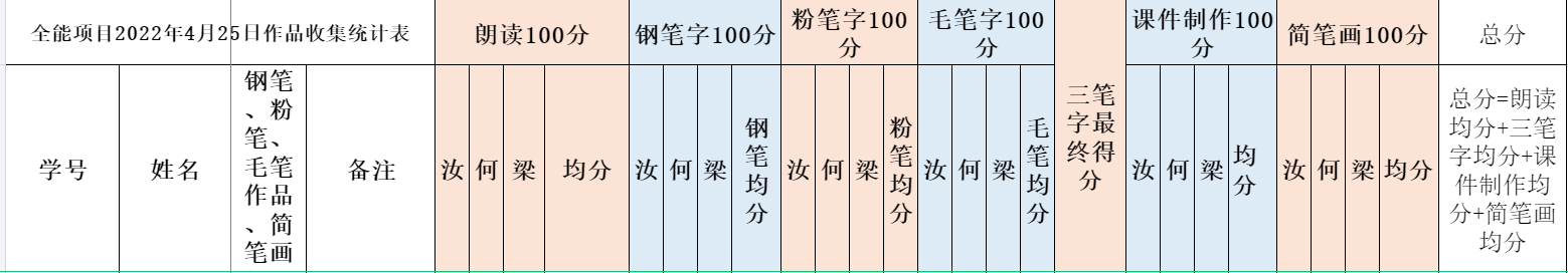 全能比赛的初赛内容包括:朗读(朗诵)与即席演讲、三笔字、课件制作以及简笔画。由于受疫情影响,以及考虑到参赛选手的时间协调问题,故初赛采取线上和线下相结合收集作品的形式进行。全能比赛项目总体难度较大,初赛报名选手共10名。经过严肃认真的评审,共选出5名选手进入复赛。朗读(朗诵)、三笔字(钢笔、粉笔、毛笔分别占比赛成绩的40%、40%、20%,按权重比例得出最终成绩)、课件制作以及简笔画每项各100分,总分共计400分。评审过程中,三位评委按照比赛规则进行评审,选手的单项成绩取三位评委评分的平均分,选手的总成绩则为朗读(朗诵)、三笔字、课件制作以及简笔画的总和,其中排名为前5的选手进入复赛。