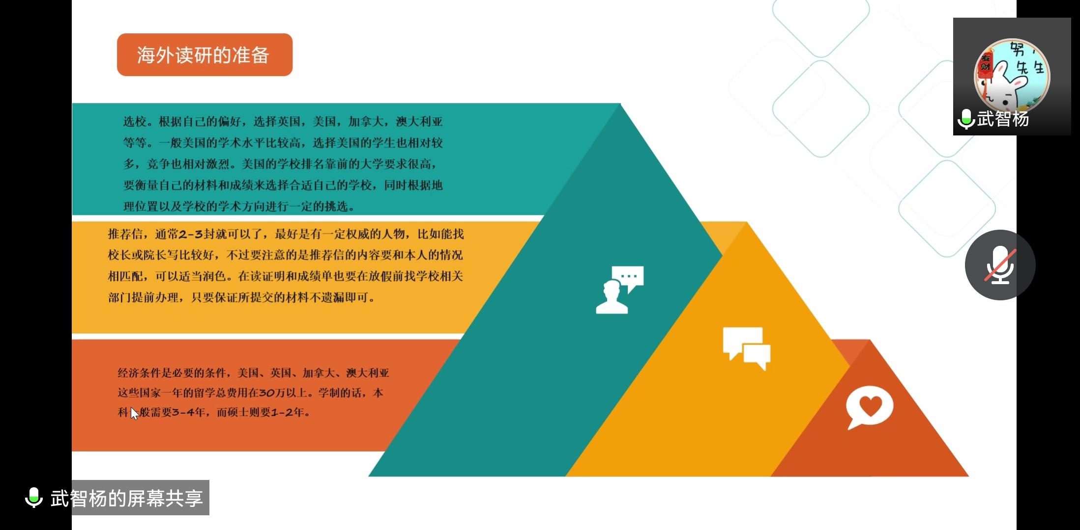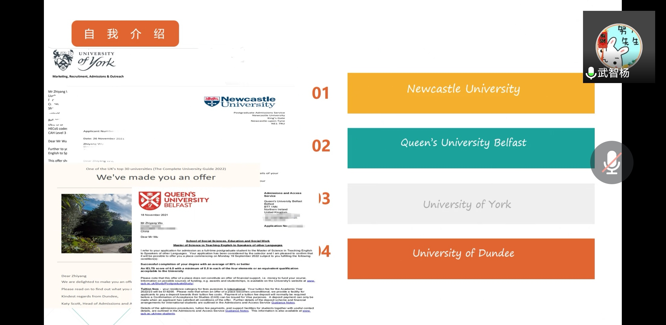 分享会上,武智杨提到自己拿到了四所海外名校的offer,最终选择了英国纽卡斯尔大学(2022年QS排名134)。武智杨先从入学、学制、学费和就业机会四个方面进行了国内外考研对比分析,从院校选择到成功录取一应俱全,介绍了自己是如何一步步申请国外院校的。在谈到海外读研前的准备时,武智杨向同学们讲述了GPA对申请国外学校的重要性,提倡同学们从大一开始认真对待每一门课,争取全部获得高分,为GPA打下基础。他提到托福、雅思的考试成绩对选择出国读研的同学来讲尤起重要,同时鼓励同学们积极参加竞赛,他认为国家级别的竞赛对申请者的英语水平有一定的证明价值。