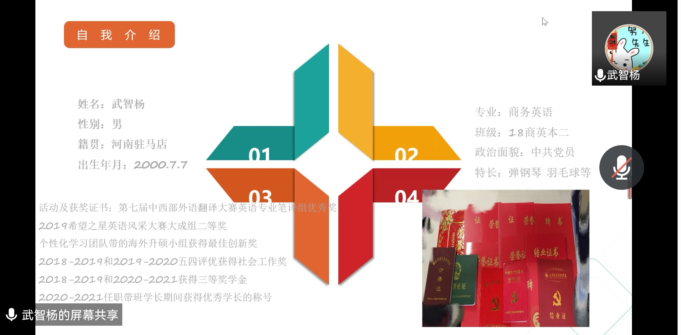 本网讯(通讯员 赵佳洁)为促进我院学风建设,帮助同学们更加顺利地实现自己考研、出国的理想,人文学院于2022年5月31日晚在腾讯会议平台进行了考研经验分享会,本次会议由18级商务英语专业武智杨主讲,由人文学院党宣干事黄浩然主持。