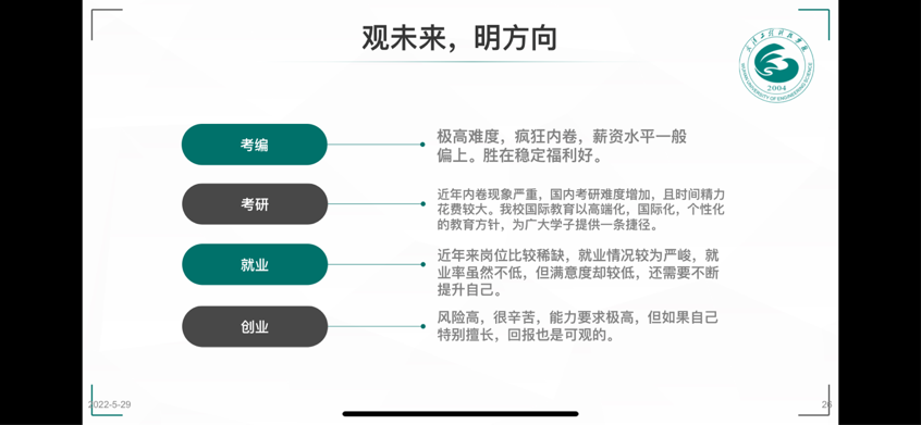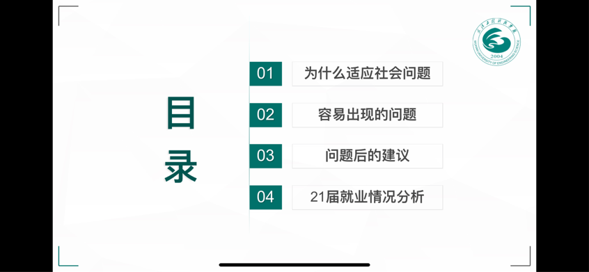 班会围绕“为什么适应社会”、“容易出现的问题”、“问题后的建议”、“21届就业情况分析”四个方面开展。班会首先从“大学生”和“职业人”所承担的责任不同进行展开分析,大学生所处环境简单,责任和负担小,整体环境较和谐,而职业人要面临复杂的人际关系以及需承担更多社会责任。辅导员在发现角色体验不同之后,随之而来会产生对“学生角色的依赖”、“对职业角色的畏惧”、“主观思想上的自傲”、“客观作风上的浮躁”四个方面的问题,同时强调,大学生在面对角色转换问题时,应及时采取思想上的正确认识,怀着正确且向上的心态不断适应新环境新角色。