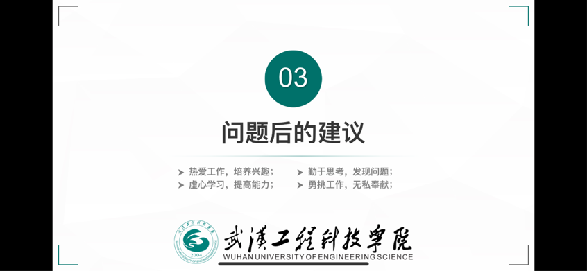 在面对大学生产生一系列不适应等问题时,辅导员呼吁大学生们应热爱本职工作,培养职业兴趣,在工作中虚心学习专业知识,提高工作能力,同时还要勤于思考观察,善于发现问题,做一个懂得变通的“职业人”。在职场生活中,辅导员鼓励学生,勇挑工作重任,乐于无私奉献,展现新青年在工作中的朝气蓬勃。