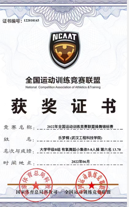 我校健美操队于6月10日参加了由国家体育总局教科司、全国运动训练竞赛联盟主办、全国运动训练联盟操舞分委会、全国青少年健美操运动技能等级推广办承办的2022年全国运动训练竞赛联盟操舞锦标赛.由于疫情影响,这次全国比赛采取的是云端形式线上直播比赛。最终我校健美操队取得了甲级B组有氧舞蹈大集体9-16人操第一名和甲级B组有氧舞蹈小集体5-8人操第六名的好成绩。