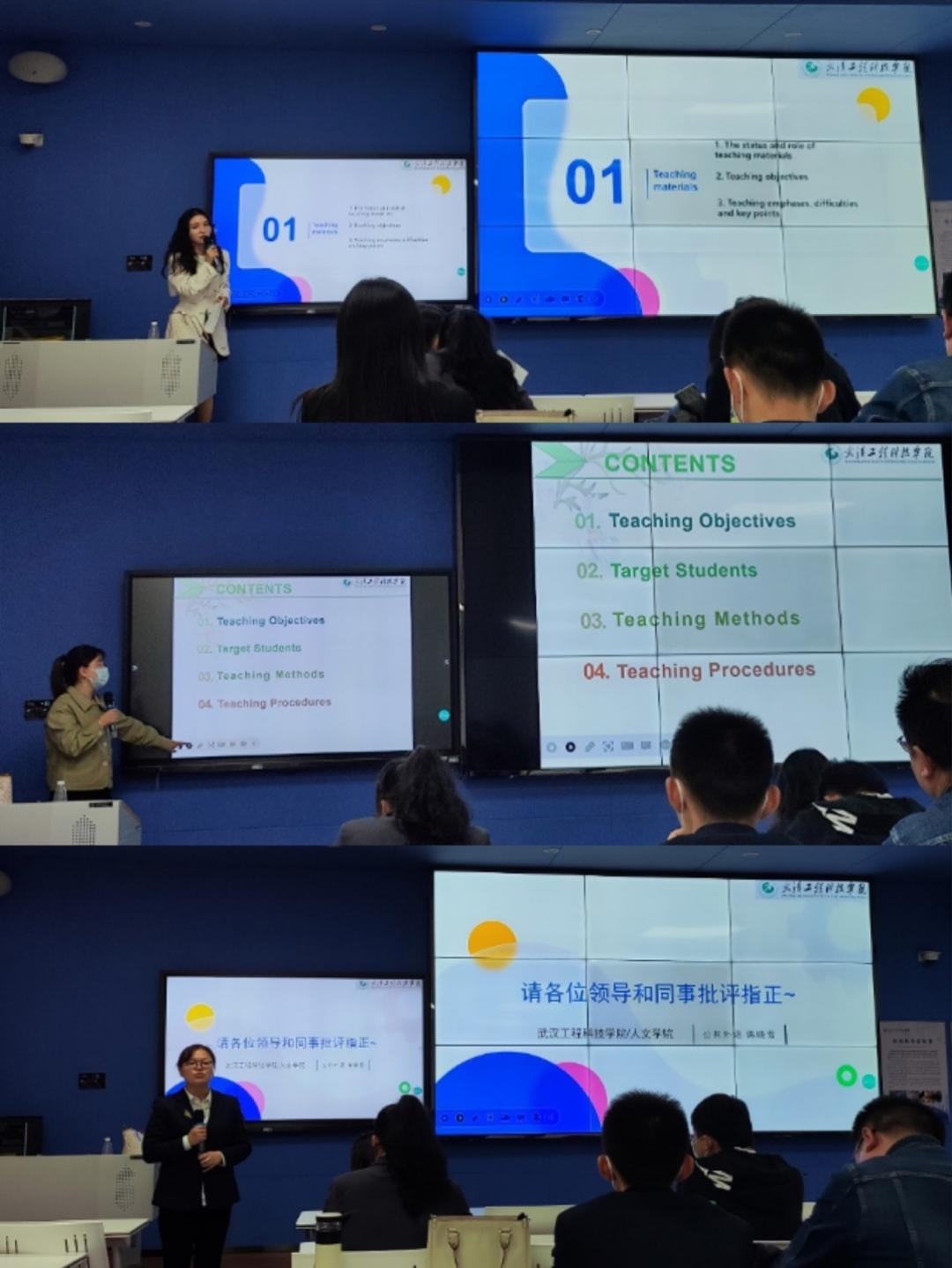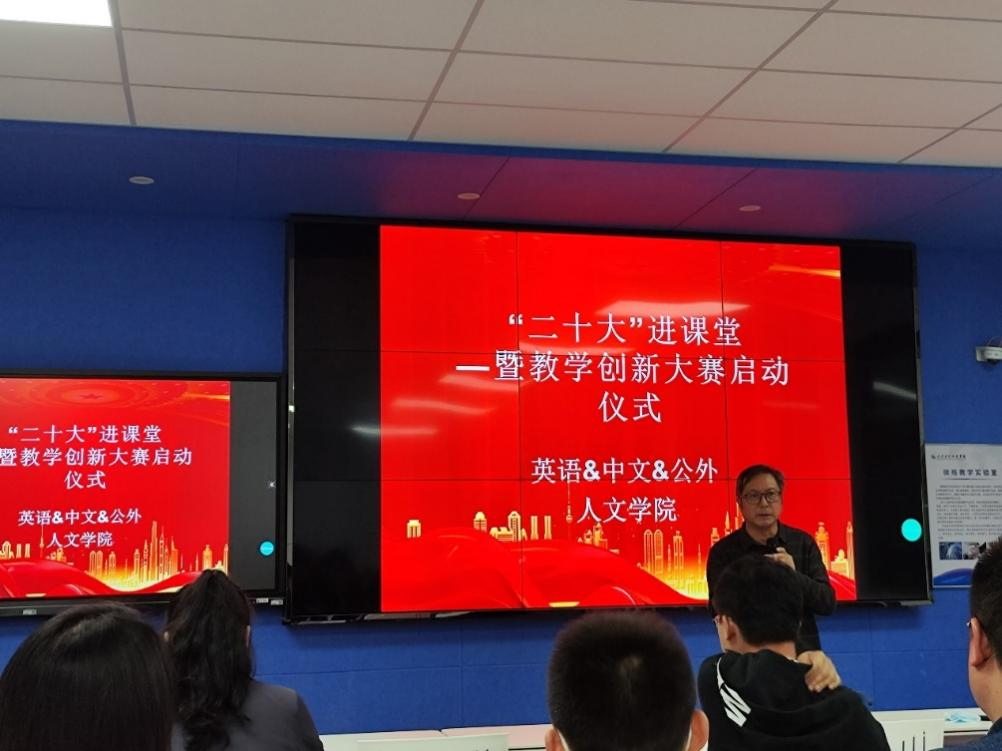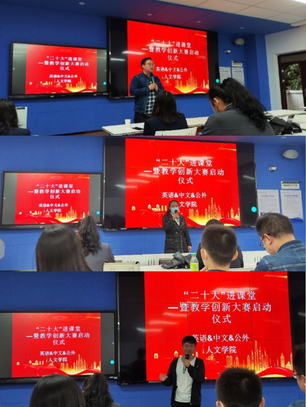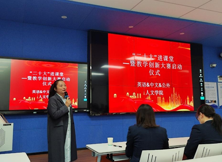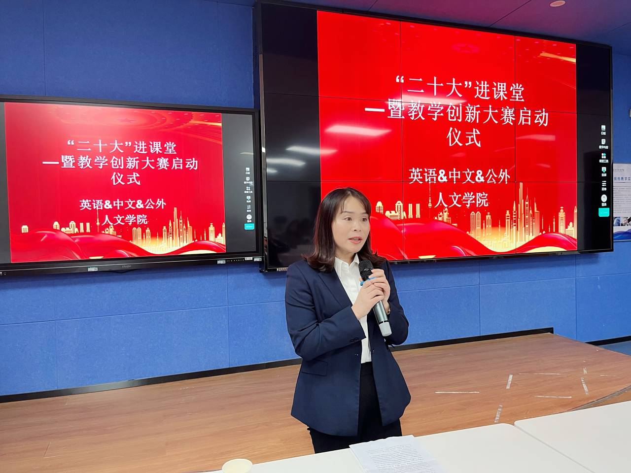 本网讯(通讯员 许弘迪)随着党的二十大胜利闭幕,为响应大会号召,讲好中国故事,传播中国声音,为了实现专业融合和跨专业交流合作,人文学院组织各系开展了一场以“二十大”进课堂为主题的教学创新大赛,出席本次活动的有人文学院院长吴亚林教授、教学副院长吴海燕教授、英语系主任孙川慧副教授、公共外语教学部主任王莹副教授、中文系主任杨敏艳副教授以及各系代表教师。各系代表将二十大报告与专业特色相结合,展示了各系优秀教师的专业风采和与时俱进的课程思政元素。本次活动由英文系主任孙川慧主持。
