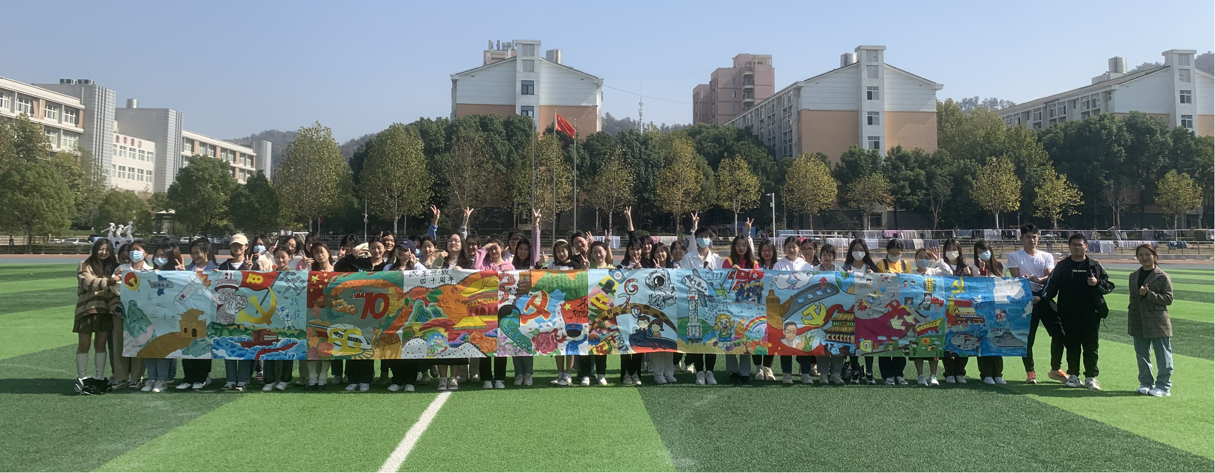 此次手绘作品由人文学院教育系学生百人以“永远跟党走 奋进新征程”为主题,历经近一周的酝酿、构思和运笔,绘画出祖国波澜壮阔的十年征程,首架国产大飞机亮相、首艘航母正式交付、超级水稻、丝绸之路经济带、复兴号高铁等,彰显着中华民族正以不可阻挡的步伐迈向伟大复兴。