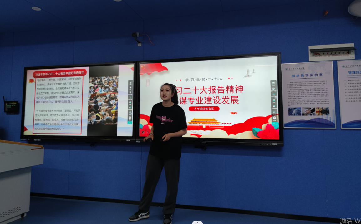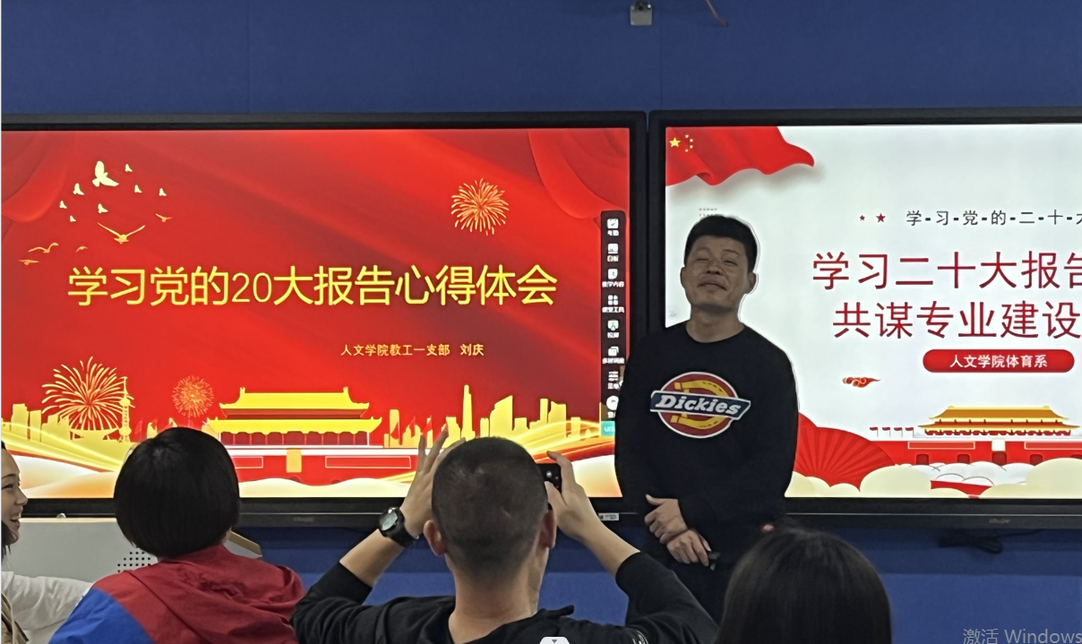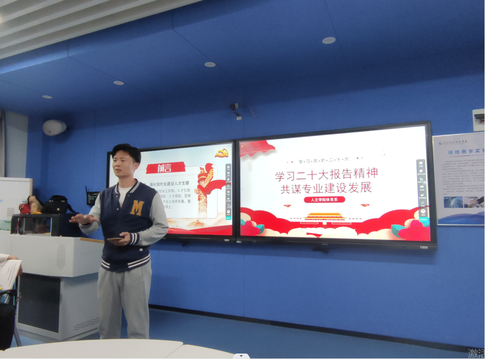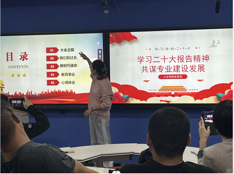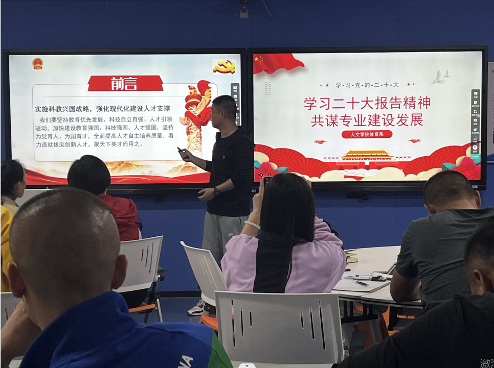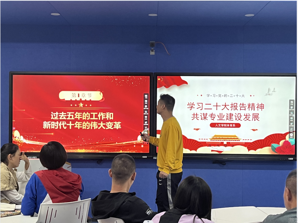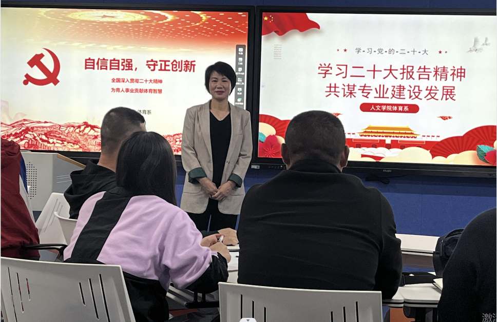 本网讯(通讯员 徐娅妮)随着二十大的胜利召开,为深入学习宣传贯彻党的二十大精神,11月9日下午在1教208智慧教室,人文学院体育系组织了以“学习二十大报告精神,共谋专业建设发展”为主题的交流会。出席本次会议的有学院实践教学副院长郭生鼎老师、体育系主任宋英、公共体育教学部易鹏老师以及体育系全体教师,本次学习交流活动分为三个环节,环节一由杨径老师带领大家集中学习党的二十大报告的主要内容,环节二各教研室代表展示分享学习心得体会,环节三是聚焦重点、知识竞答。大会由体育系杨径老师主持。