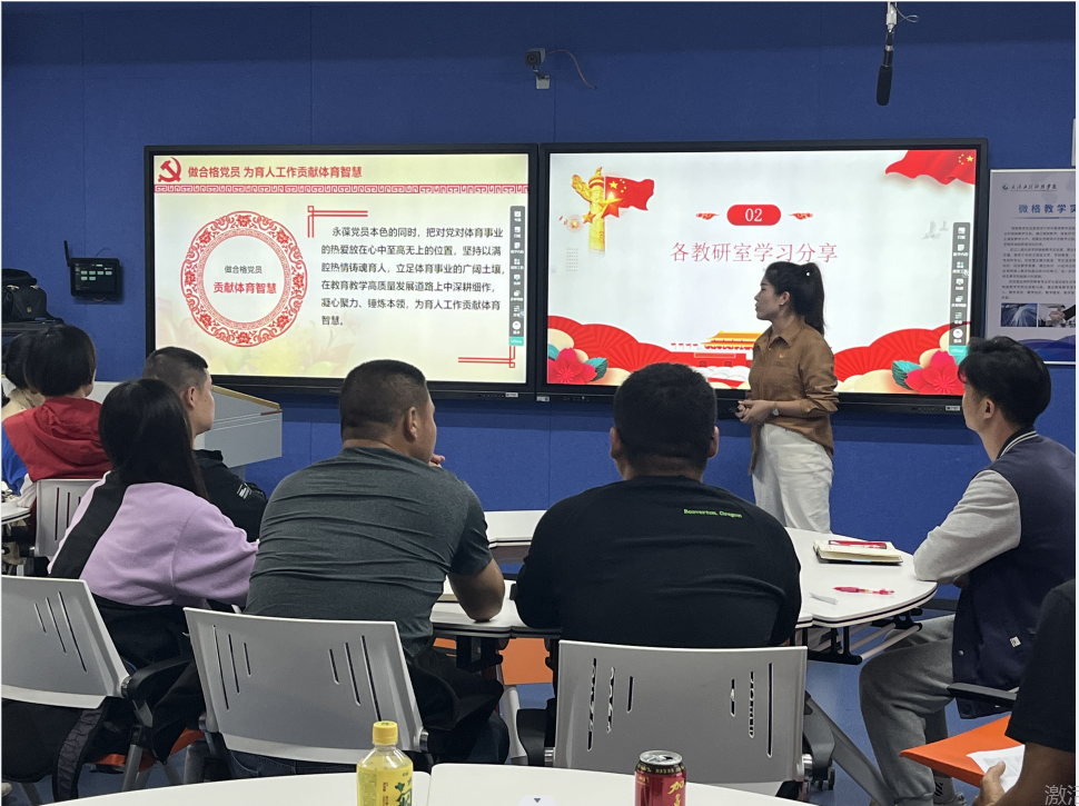 随后各办公室代表上台分享。108办公室万燕老师谈到深入贯彻落实习近平总书记“促进群众体育和竞技体育全面发展,加快建设体育强国”的要求,展望体育事业未来发展蓝图,体育领域的工作者自当豪情满怀、壮志飞扬,我们对加快体育强国建设充满信心。在永葆党员本色的同时,我们应该将对党对体育事业的热爱放在心中至高无上的位置,坚持以满腔热情铸魂育人,立足体育事业的广阔土壤,在教育教学高质量发展道路上中深耕细作,凝心聚力、锤炼本领,为育人工作贡献体育智慧。