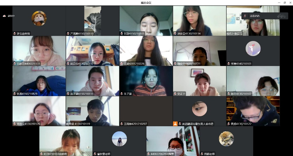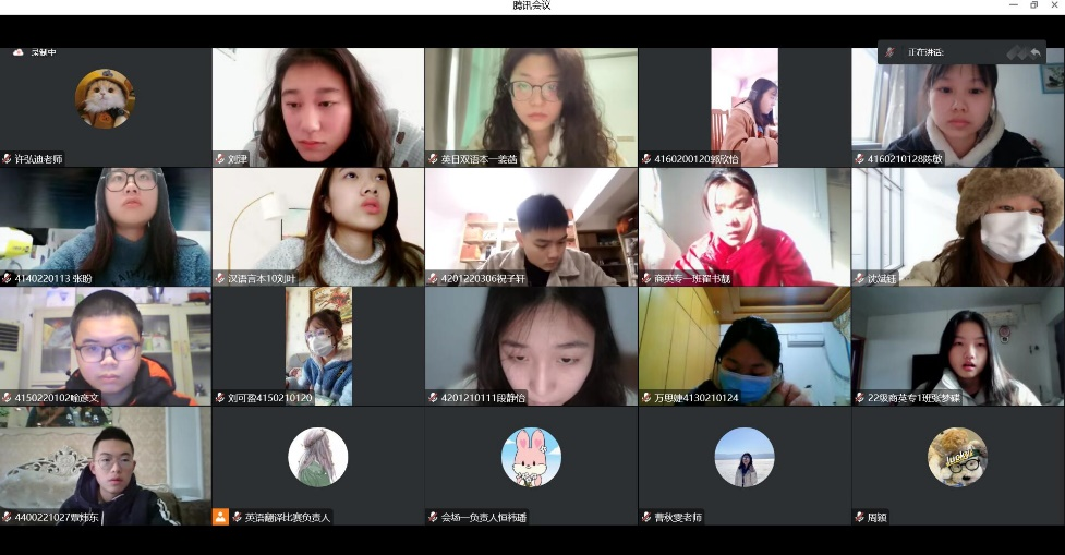 本次比赛吸引了来自全校多个专业的学生共同参与,其中英语参赛选手48名,日语参赛选手15名,法语参赛选手11名。比赛通过腾讯会议APP线上进行,参与本次演讲比赛的评委老师有英语老师许弘迪、法语老师曹秋雯和日语老师周颖。