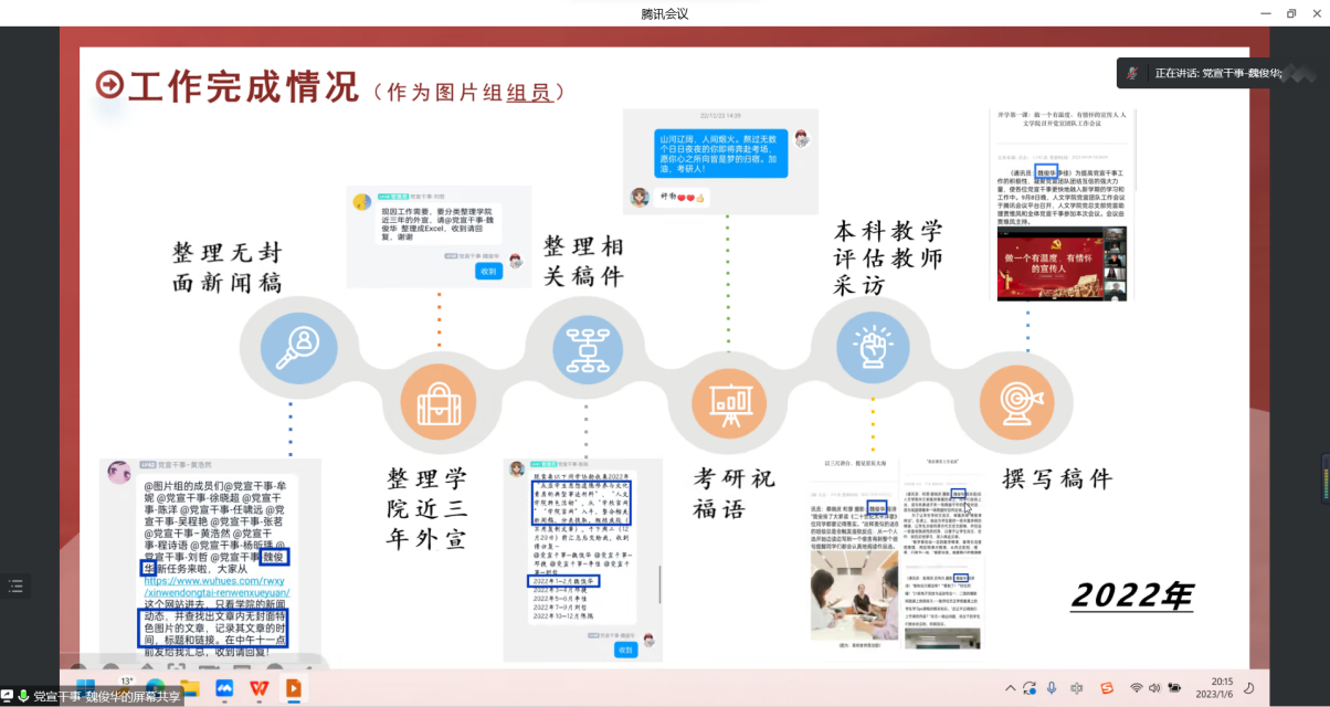 本网讯(通讯员 陈瑞)为深入贯彻落实习近平总书记在党的新闻舆论工作座谈会的讲话精神,进一步加强团队建设,全面回顾和总结团队前期各项工作,2023年1月6日下午,人文学院党宣团队于腾讯会议平台召开了2022年度工作总结汇报会议。人文学院宣传老师吴靖及党宣团队全体成员参会。