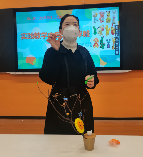 刘胜男老师针对自己下学期所教的《幼儿园玩教具与手工制作实训》课程展示了自己的教学用具和教学程序,并且详细的阐述了各种教学工具在此次实践课程当中的重要作用。