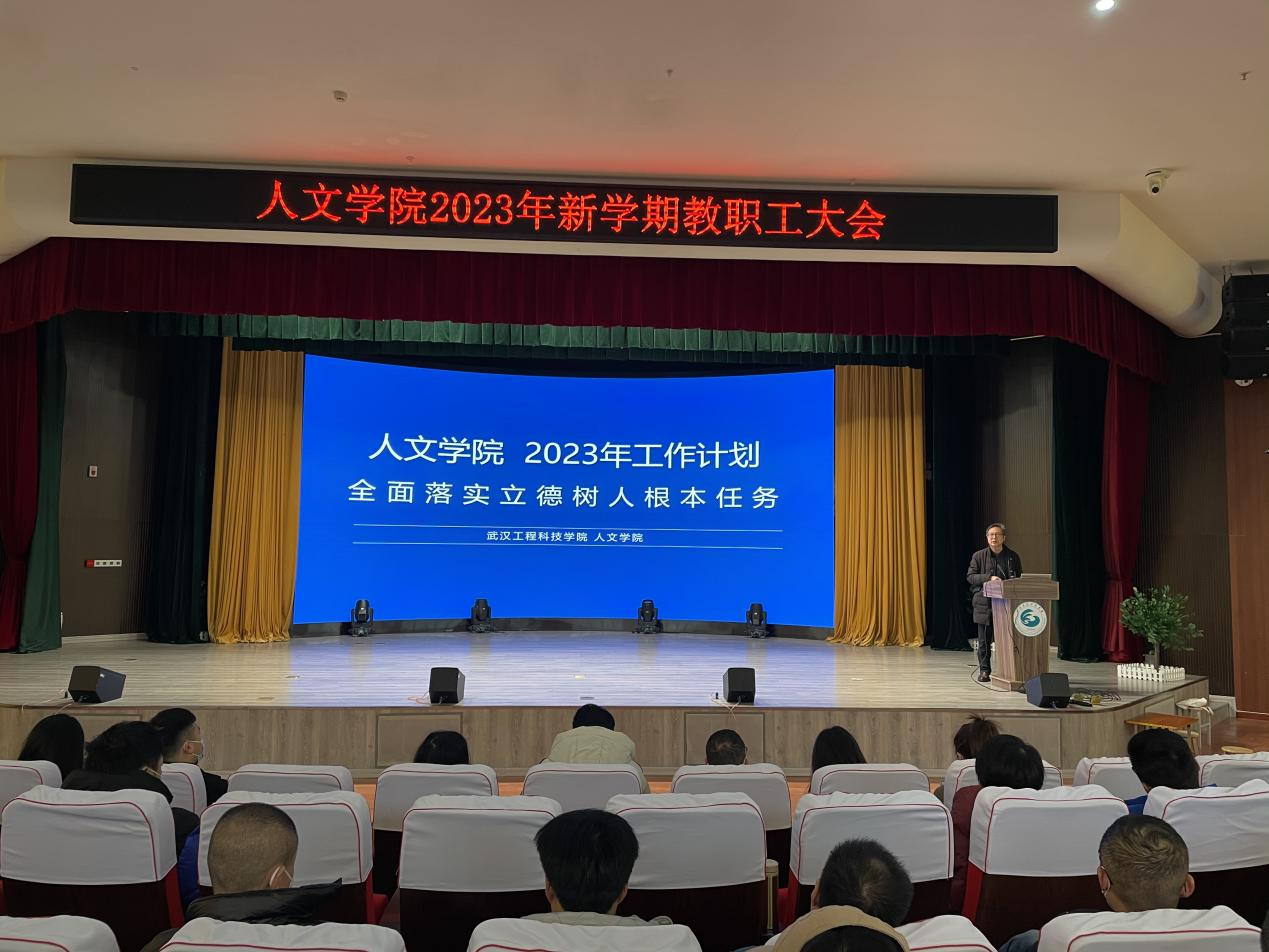 本网讯(通讯员 陈瑞)为确保新学期开好局、起好步,更好地统筹和安排新学期的各项工作,2月11日上午,人文学院于图书馆五区报告厅召开了2023年新学期教职工大会。人文学院院长吴亚林、党总支书记李毅、副院长吴海燕、郭生鼎出席了本次会议,学院全体教职工参加了本次会议。