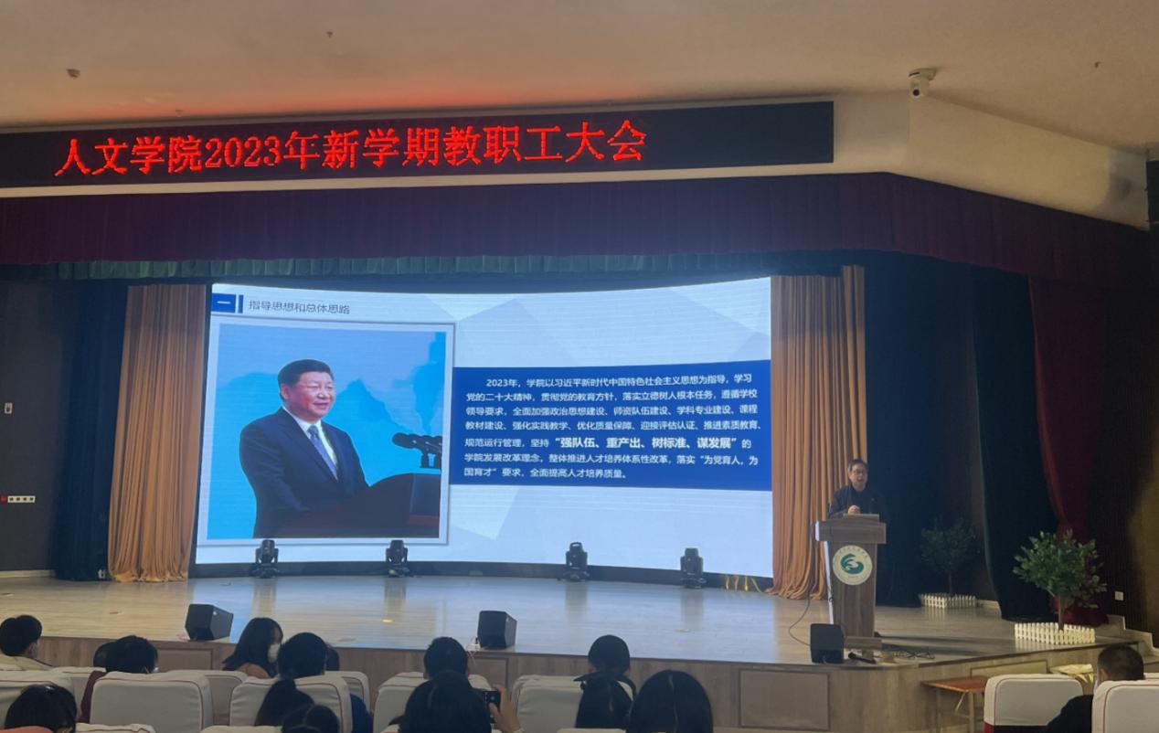 吴亚林向全体教职工传达了人文学院2023年度工作的指导思想和总体思路,他强调了学院以习近平新时代中国特色社会主义思想为指导,学习党的二十大精神,贯彻党的教育方针,落实立德树人的根本任务,将全面加强政治思想、师资队伍等建设,大力推进素质教育,坚持“强队伍、重产出、树标准、谋发展”的学院发展改革理念,整体推进人オ培养体系性改革。随后吴亚林阐述了“强队伍、重产出、树标准、谋发展”重要性和必要性。他期望全体教职工们以崭新的姿态迎接好2023学年,落实好“为党育人,为国育才”的要求,全面提高人才培养质量。