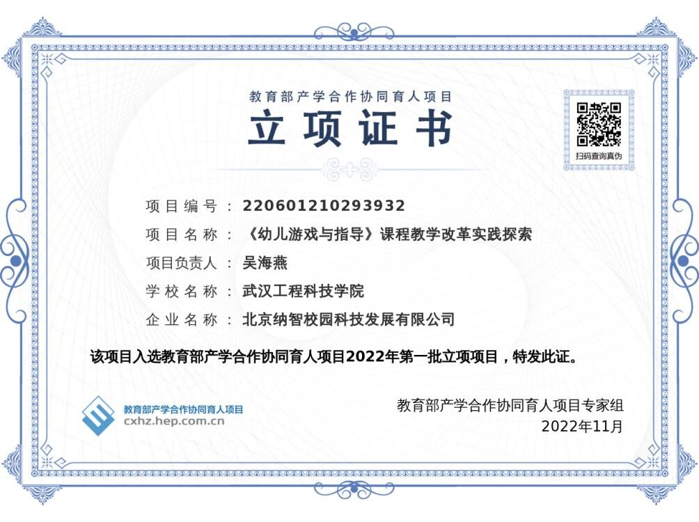 人文学院2022年第一批教育部产学合作协同育人立项项目有吴海燕教师团队的“《幼儿游戏与指导》课程教学改革实践探索”、孙川慧教师团队的“武工院‘师长’促‘生长’实践基地建设”、罗莉教师团队的“人工智能时代高校翻译教师发展模式创新”三项。