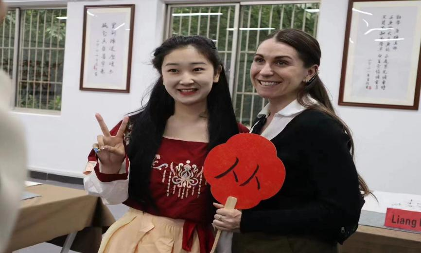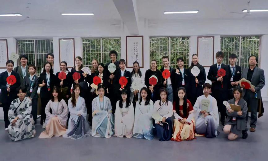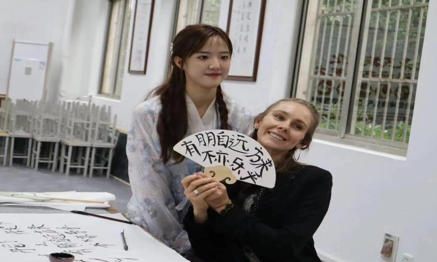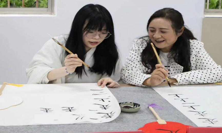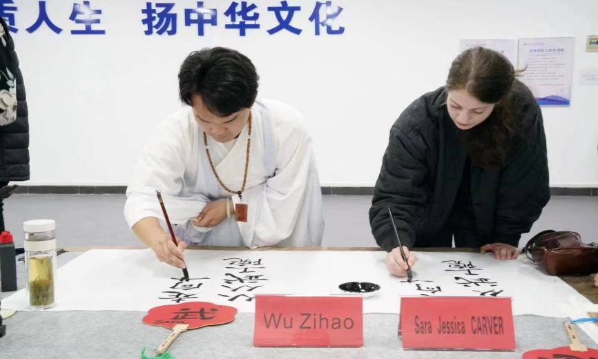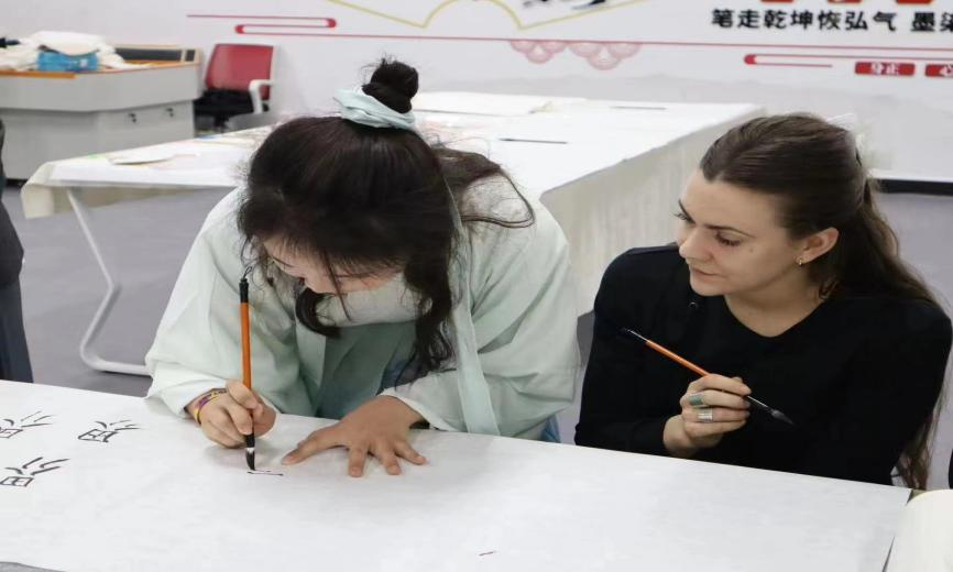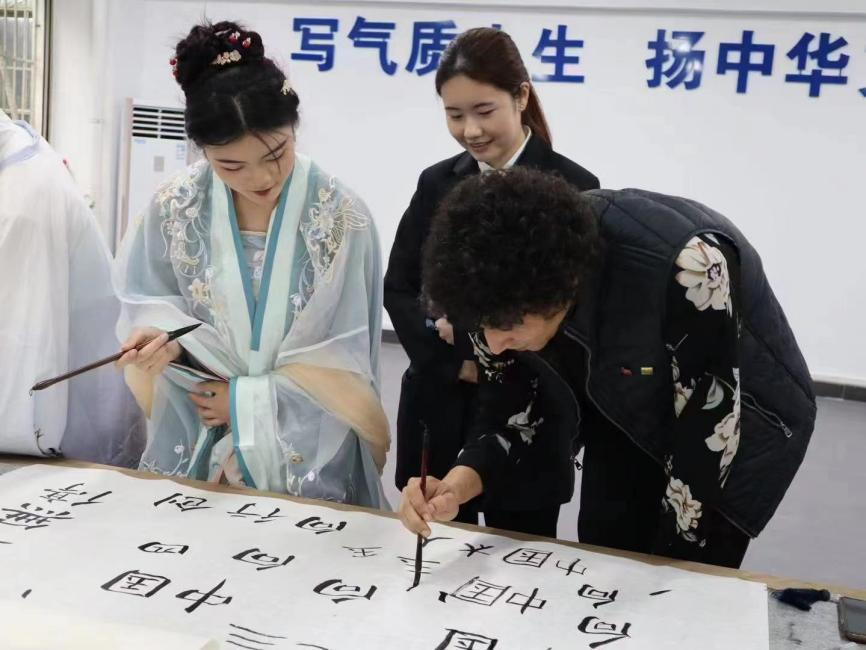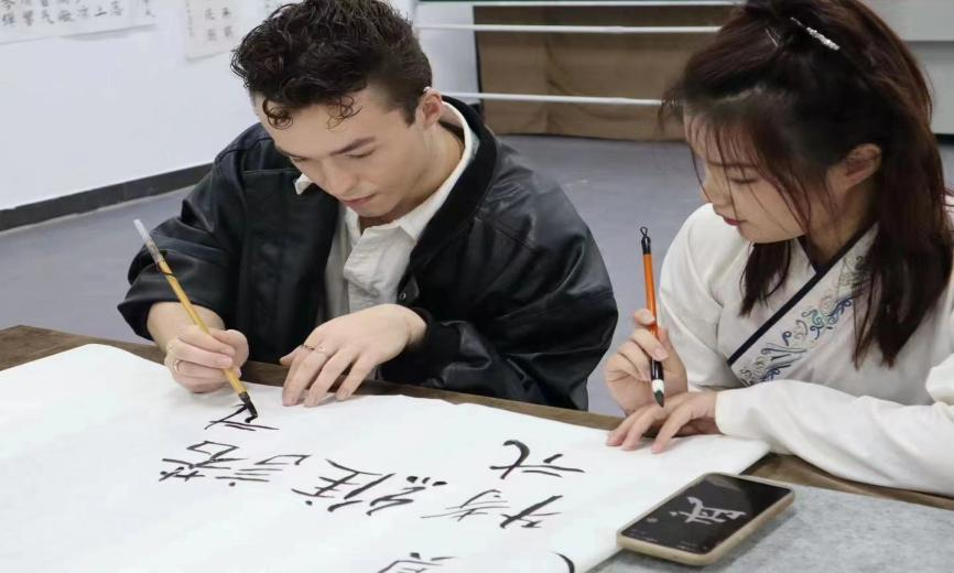 (图为:武工院学子们带领艺术家们体验中国的书法艺术)