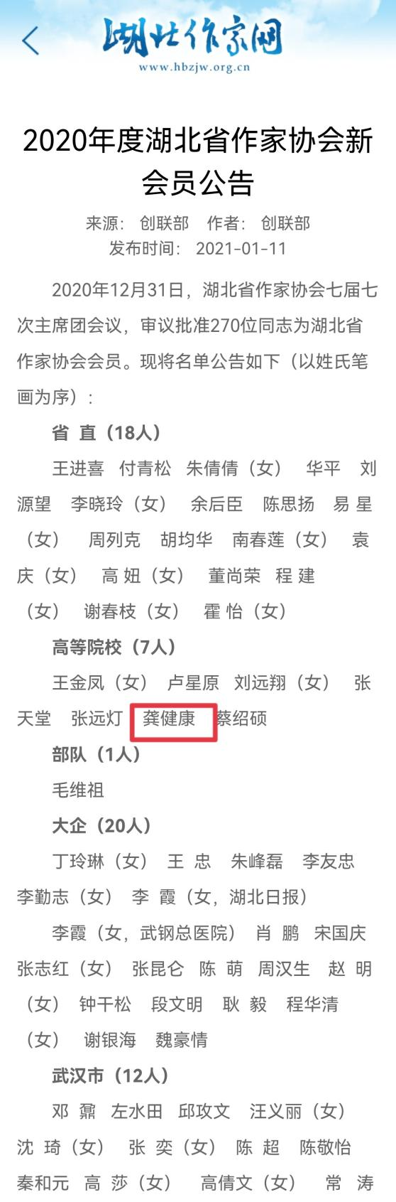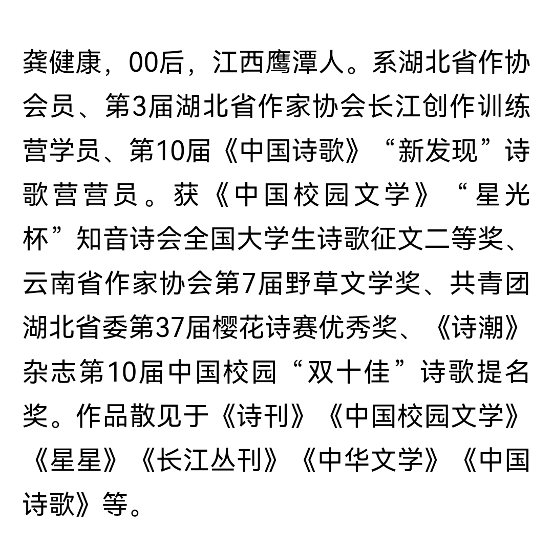 据了解,龚健康曾参加湖北省作家协会第三届“长江创作”中青年作家训练营、《芳草》杂志首届新锐作家营、《中国诗歌》第十届“新发现”诗歌营。他曾获《中国校园文学》“地质杯”自然文学大赛三等奖、《中国校园文学》“星光杯”知音诗会全国大学生诗歌征文二等奖、云南省作家协会第七届野草文学奖等,另有摄影作品入选山西省平遥国际摄影展。
