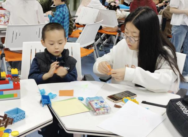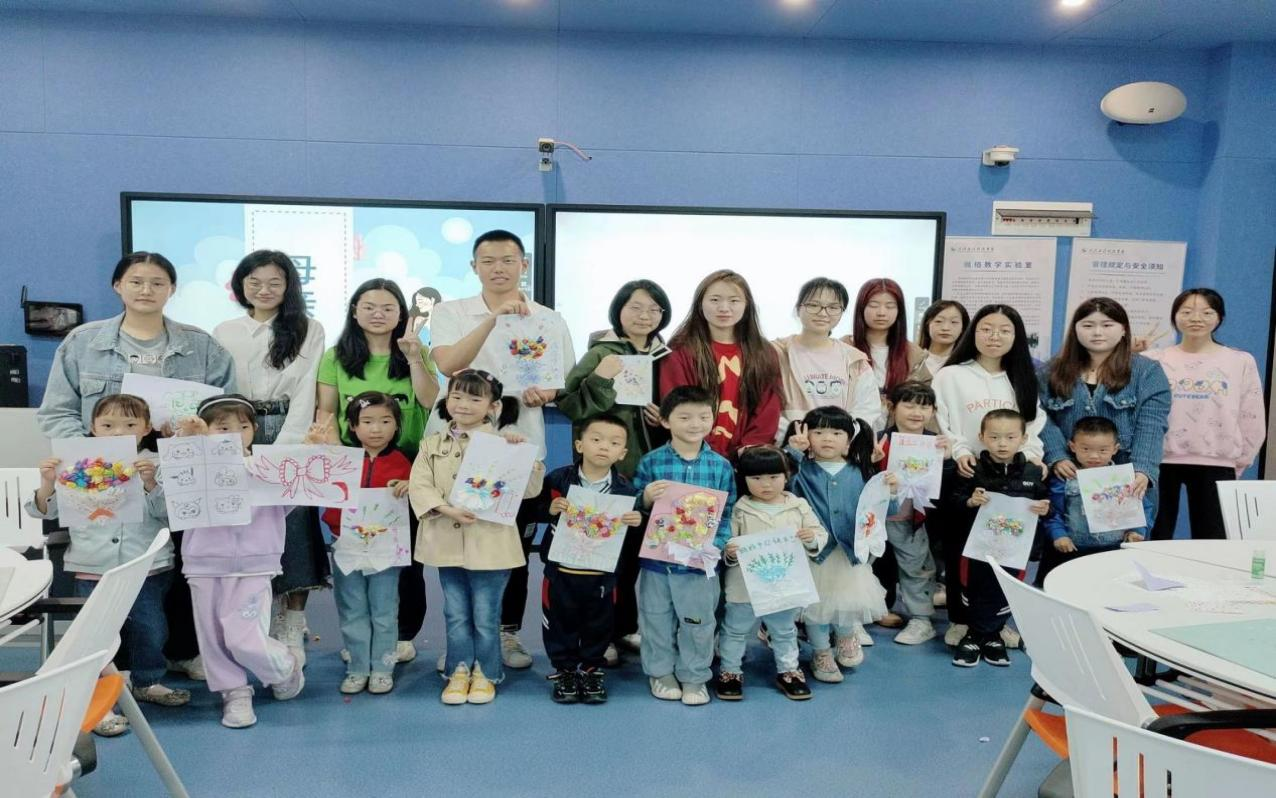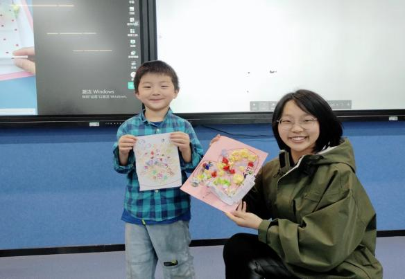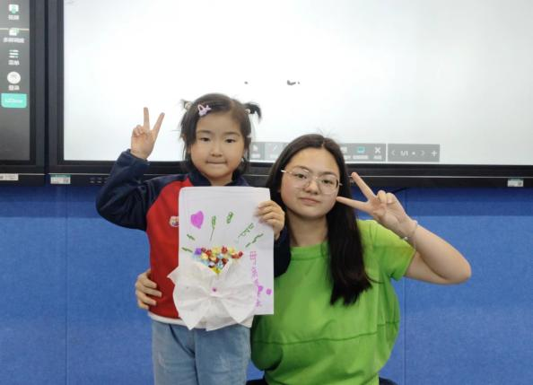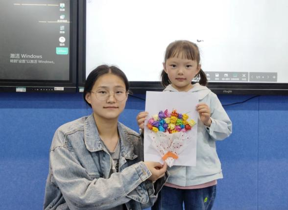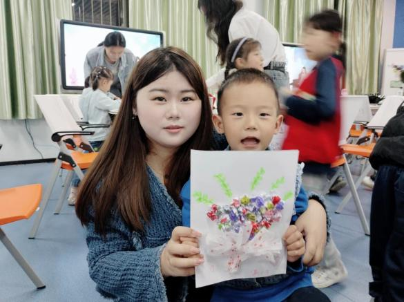 摄影小老师给每一位小朋友和她们完成的小作品同各自陪伴的小老师拍了照片,她们完成创意花束的创作后,脸上洋溢着笑容,迫不及待地想把这份心意送到妈妈手中。