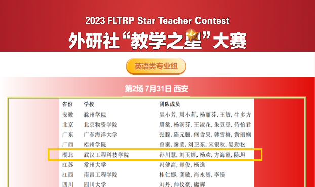 本网讯(通讯员 杨欢 孙川慧)2023年6月19日,“教学之星”大赛2023年全国半决赛晋级名单及全国复赛获奖名单公布,武汉工程科技学院人文学院英语系团队获得全国复赛特等奖,闯进英语类专业组全国半决赛,将于7月31日赴西安参赛。