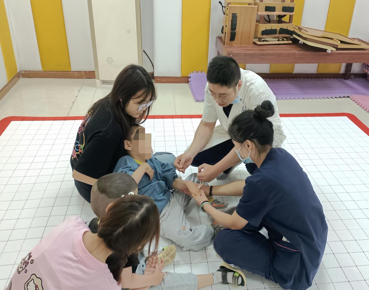 团队成员们在福欣医院康复科中心负责人的带领下,参观了康复中心的设施和场所,观看了听觉言语训练、生活自理能力训练、认知能力训练等课程,并与康复治疗师进行深入交流,详细询问了正在进行康复训练儿童的生活状况、精神状态以及康复效果。随后,在康复治疗师的指导下,团队成员们带领孩子们参与感统训练游戏,引导他们专心完成各项康复训练。