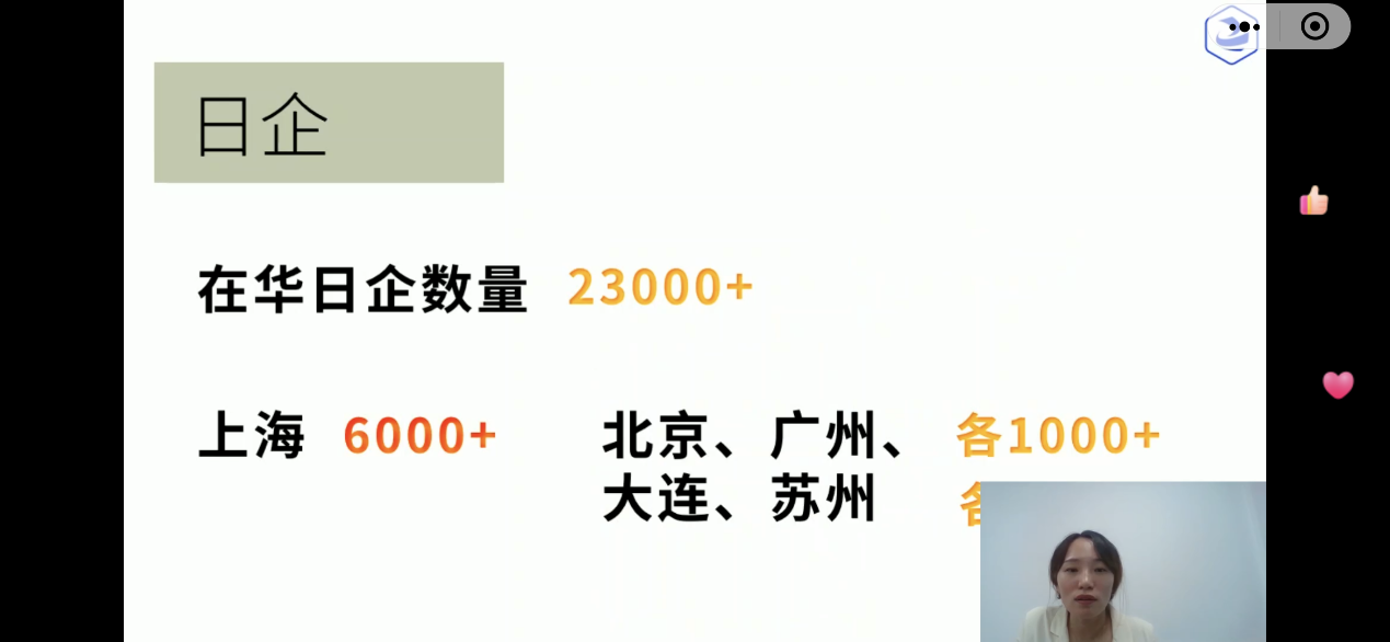 接着,她简要介绍了日语方向学生毕业后的各项工作选择以及当前日语方向就业现状。她指出,日语方向学生工作方向主要有三大类,日资企业、国家机关和国内企业,其中毕业后选择进入日企的占50-60%。接下来,她分别详细描述了日企、国家机关和国内企业针对日语方向学生的就业岗位、就业特点及优势,建议学生结合个人性格特点、爱好及特长,提前确定好就业方向和岗位,在了解岗位所需必备技能的情况下有针对性的学习和提高有关技能,强化个人工作匹配度。