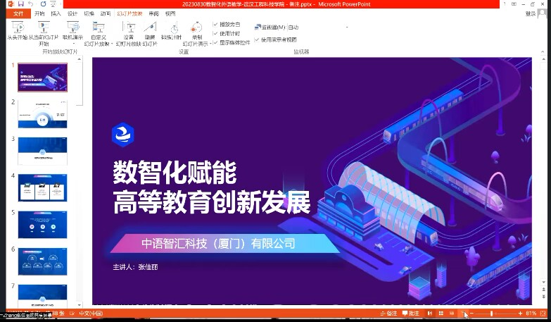 会议伊始,厦门大学应用语言学硕士、跨境电子商务师、现任中语智汇科技有限公司高级产品经理张佳丽女士就“教育领域如何应对信息社会和数字经济的发展趋势,如何推动实现教育数字化转型”分享了成功经验,并与教师们进行深入探讨与充分交流。她紧紧围绕着“数智化赋能高等教育创新发展”这一主题,分别从数智化赋能高等教育、数智化探索与实践、构建互联网教育新生态三个方面分享了数智化带来的益端、跨境电商与实践教学平台的应用和一流课程建设展示。她提出要以信息化全面赋能教育,提供更高质量、更加公平、更多选择、更加便捷、更加开放、更加灵活的教育服务科技将持续服务高等教育。