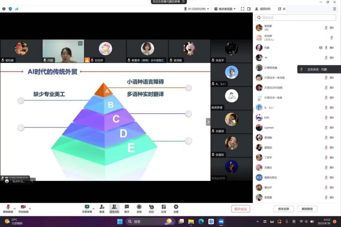 本网讯(通讯员 苏北 刘玉婷)在新学期来临之际,伴着夏末余温,八月三十日下午,人文学院外语系21级全体学生在外语系孙川慧主任,刘玉婷老师和中语智慧的企业导师的组织和带领下开启了独属于外语系本学期的“开学第一课”。会议主题为“AI时代下英语及商务英语就业前景分析分享会暨优秀学长学习经验分享会”。