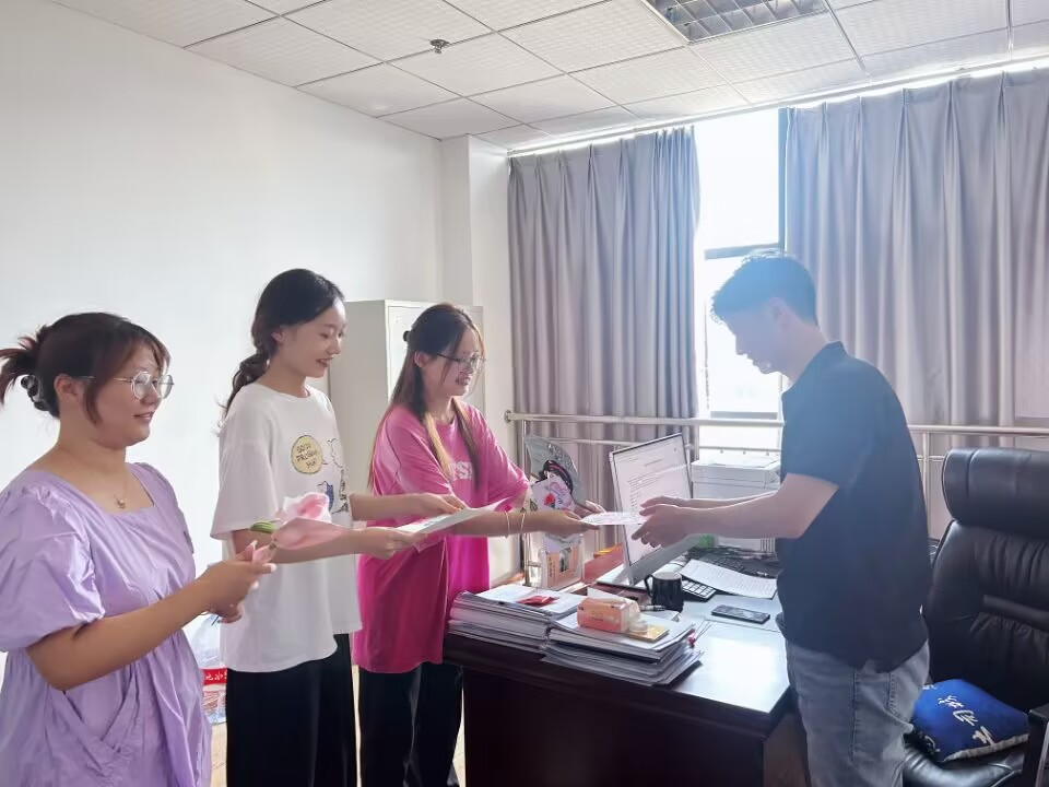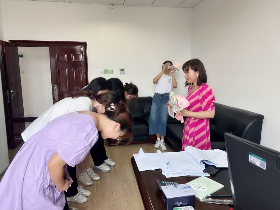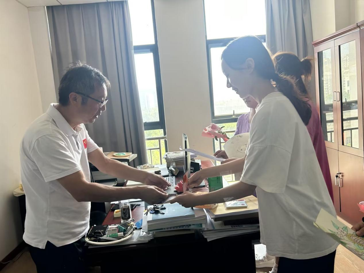 “三尺讲台,两袖清风,回首只闻桃李香。”贺卡上饱含深情的文字,精心描绘的图案,巧手制作的非遗绒花,色彩鲜艳,犹如桃李芬芳。贺卡和绒花的制作锻炼了教育系学生的教师职业技能,也汇成学生对教师最崇高的敬意和和最诚挚的祝福。在人文学院院长吴亚林、李毅书记、副院长吴海燕、郭生鼎办公室里、辅导员的工作现场,学生将贺卡和绒花送给他们,并深深地鞠躬,感谢院领导和老师们的精心栽培,祝福老师节日快乐!