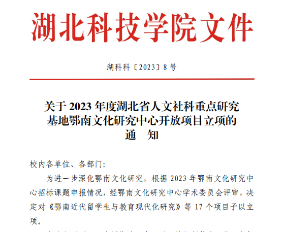 本网讯(通讯员 郭生鼎)近日,湖北省高等学校人文社会科学重点研究基地——鄂南文化研究中心,2023年度科研开放基金项目评审结果揭晓。武汉工程科技学院以卓越的研究实力再次受到了高度认可,人文学院共有三项研究项目成功获得立项资助。